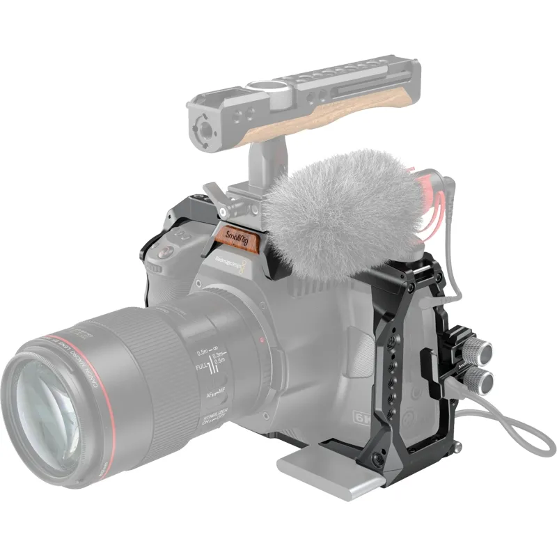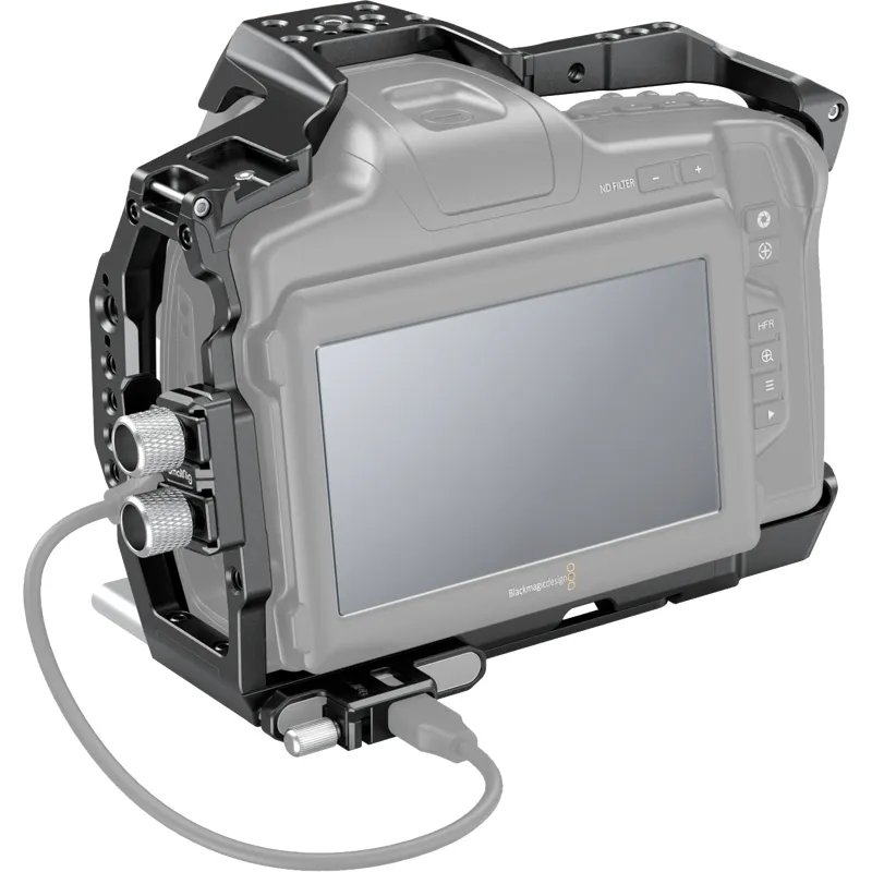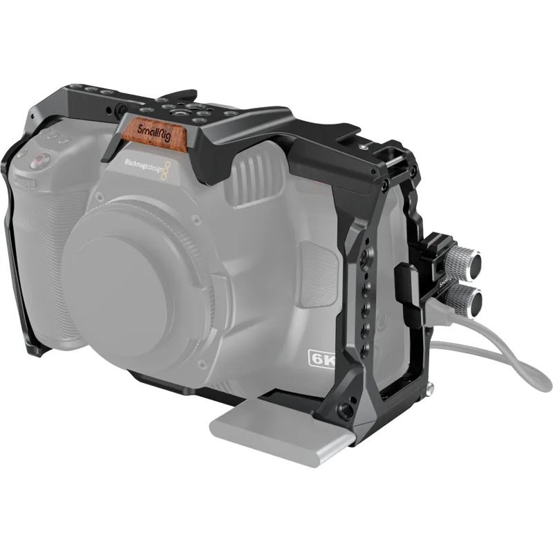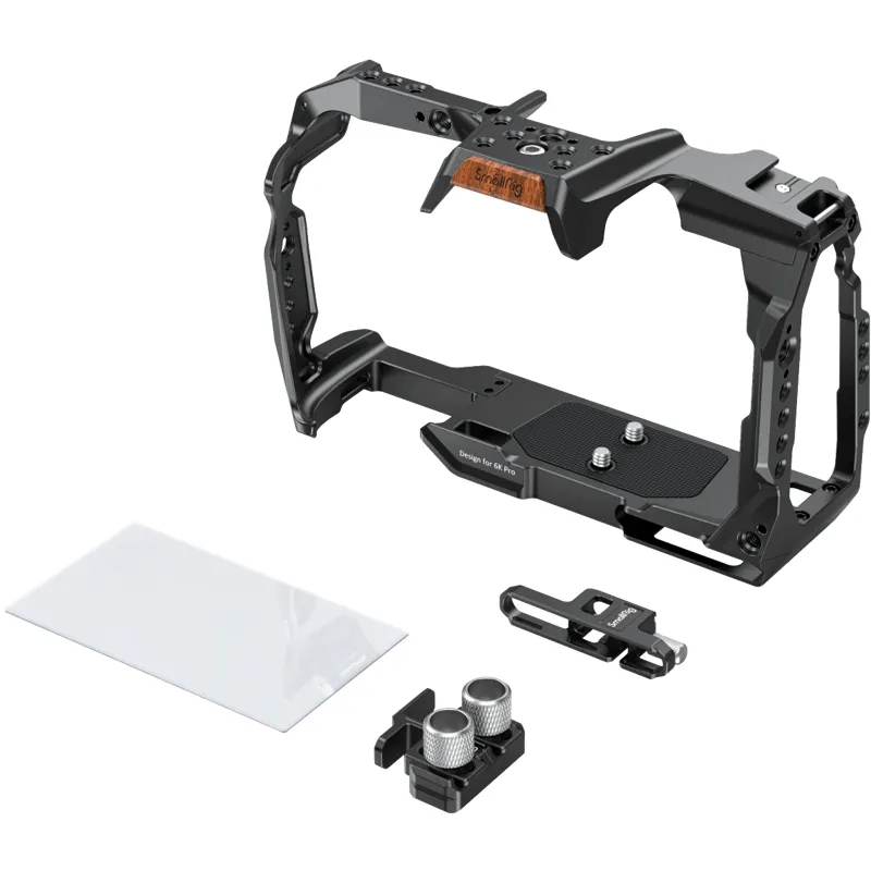 SmallRig Standard Accessory Kit for BMPCC 6K Pro 3298 provides a rugged aluminum-alloy rabbit cage with multiple 1/4"-20 threaded holes that support additional camera accessories. The kit features a built-in T5 SSD clamp and USB-C cable clamp, which can be further locked with a knob to prevent accidental disconnection during shooting. Its two tempered films can be easily pasted onto the screen via electrostatic adsorption to protect the camera.