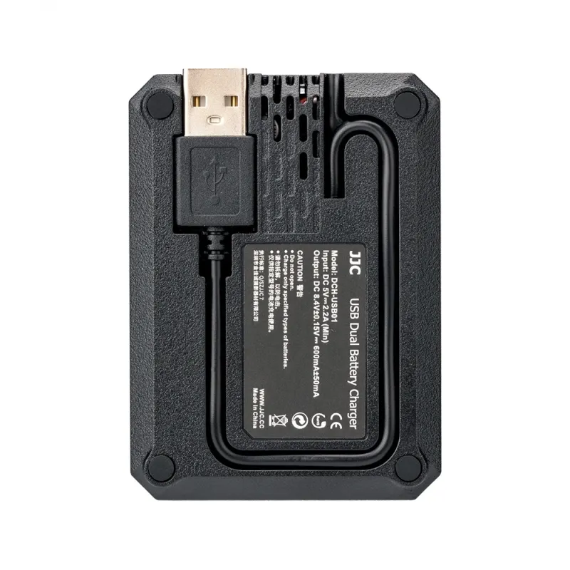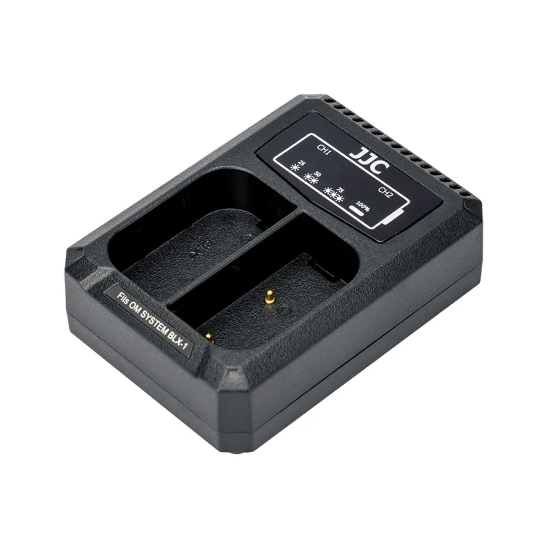 JJC DCH-BLX1 USB Dual Battery Charger is specially designed for charging Olympus OM System BCX-1 Lithium-ion Battery, which allows you to charge one or two BLX-1 batteries at the same time. Powered by USB sources, you can charge your battery with AC adapter, laptop, power bank or car charger, which enables you to refresh your battery wherever and whenever, thus prolonging your photography time. The 2 indicators show the status of the battery, and they will flash when charging and be constant on when charging is complete. Besides that, the charger will automatically detect when the batteries are fully charged and stop charging to prevent damage to your batteries. In addition, with the built-in USB cable, this battery charger is convenient to carry.
