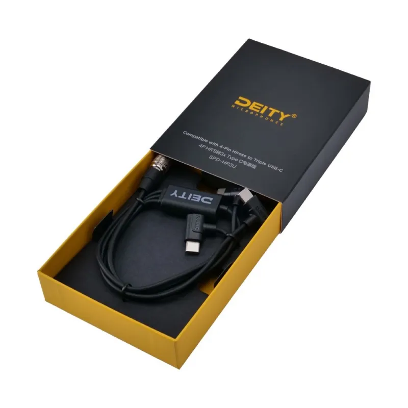 Introducing the SPD-HR3U, a 4-Pin Push-Power to Triple USB-C cable from Deity Microphones. This innovative product is designed to work seamlessly with Hirose-compatible power distributors like the SPD-1 or Audio Root, providing a reliable and versatile power solution for your audio equipment.