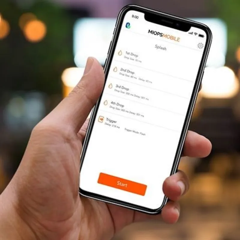 Miops Splash ir pasaulē pirmais automātiskais ūdens pilienu komplekts, kas ļauj uzņemt skaistas ūdens pilienu fotogrāfijas. Splash kontrolē ūdens padevi, kameru un ārējo zibspuldzi, lai garantētu veiksmīgu rezultātu. Sistēmu var vadīt, izmantojot bezmaksas lietotni savā iPhone vai Android viedtālrunī. Lietotne ļauj iestatīt ūdens piliena(-u) lielumu un norādīt, kad tiek iedarbināta zibspuldze un kamera.
