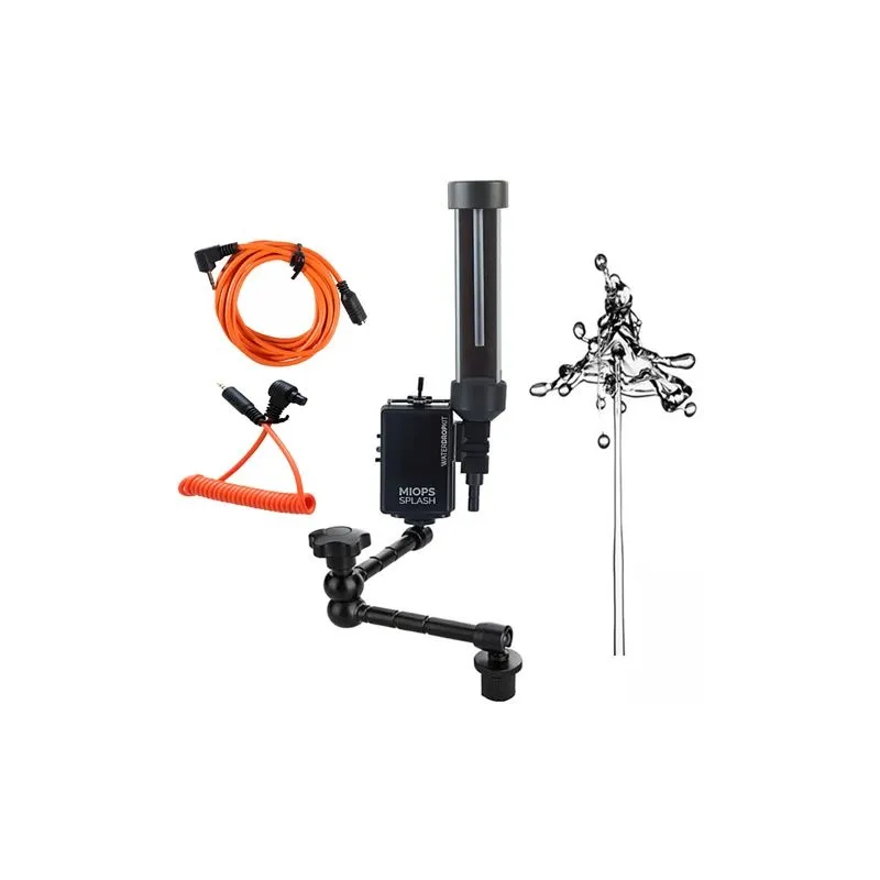 This set also includes a flexible rod and extendable holder. This allows you to position the Miops Splash, for example, above a bowl of water into which the water droplets fall. The arm can be fixed in any desired position using the rotary knob on the side. There is a 1/4" female thread on both the arm and the holder. This allows you to attach it to almost any conventional (table) tripod. A hotshoe adapter is also included, so you can also use the Miops Splash on your camera. The Miops Splash requires USB power. You can provide this by connecting the Splash to a power bank, laptop, etc. using the included micro-USB cable.