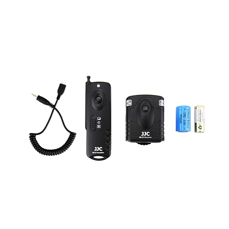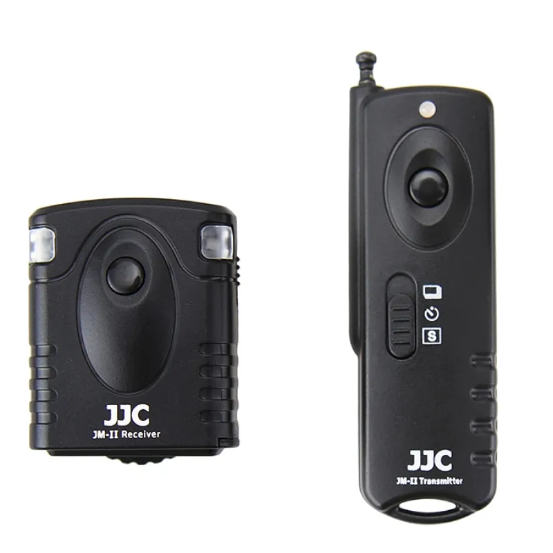 JJC JM-N II bezvadu tālvadības pults kamerām JJC JM-II sērijas radiofrekvences bezvadu aizvara ir paredzēta lielākajai daļai DSLR un SLR kameru, kurām kameras korpusā ir tālvadības pults ligzda. Sistēma darbojas 433MHZ frekvencē, un tai ir pieejami 16 kanāli. JM-II uztvērējs vienkārši tiek piestiprināts saderīgas kameras piederumu kurpim, un pēc tam vienkārši savieno komplektā iekļauto JJC uztvērēja kabeli ar kameras tālvadības pults ligzdu. Uztvērēju darbina viena CR-2 litija baterija, bet raidītāju - viena 23A baterija.