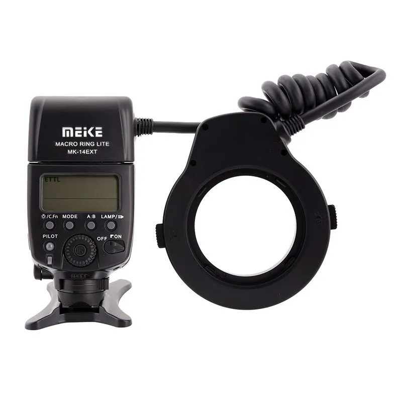Meike MK-14EXT Makro gredzenveida zibspuldze Canon Meike MK-14EXT Makro gredzenveida zibspuldzes ierīcei ir divas zibspuldzes caurules, kuras var regulēt kopā vai atsevišķi. Tas ļauj viegli ietekmēt to, kā ēna krīt uz jūsu objekta. MK-14EXT lietošana ir ļoti vienkārša, pateicoties regulatora aizmugurē esošajam ciparvadības riņķim un spiedpogu pogām. Veiktos iestatījumus var viegli nolasīt uz liela LCD displeja ar apgaismojumu. Spilgts fokusa palīgdiodes indikators ļauj viegli fokusēt kameru uz fotografējamo objektu. Komplektā ir iekļauts astoņu adaptera gredzenu komplekts, lai gredzenveida zibspuldzi varētu izmantot praktiski ar jebkuru objektīvu.