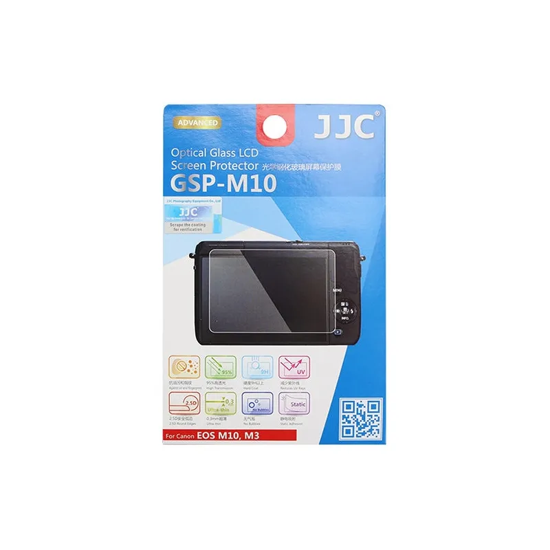 JJC GSP-M10 optiskā stikla aizsargs JJC GSP-M10 optiskā stikla aizsargs aizsargā Canon EOS M3 vai M10 sistēmas kameras displeju no skrāpējumiem, putekļiem, pirkstu nospiedumiem un citiem netīrumiem. Ekrāna aizsargs ir īpaši pielāgots šīs kameras displejam. Plēvi ir viegli uzlikt un atkal noņemt. Materiālam ir augsta gaismas caurlaidība, un tas minimāli atstaro gaismu. Tāpēc visa informācija uz ekrāna ir skaidri redzama.