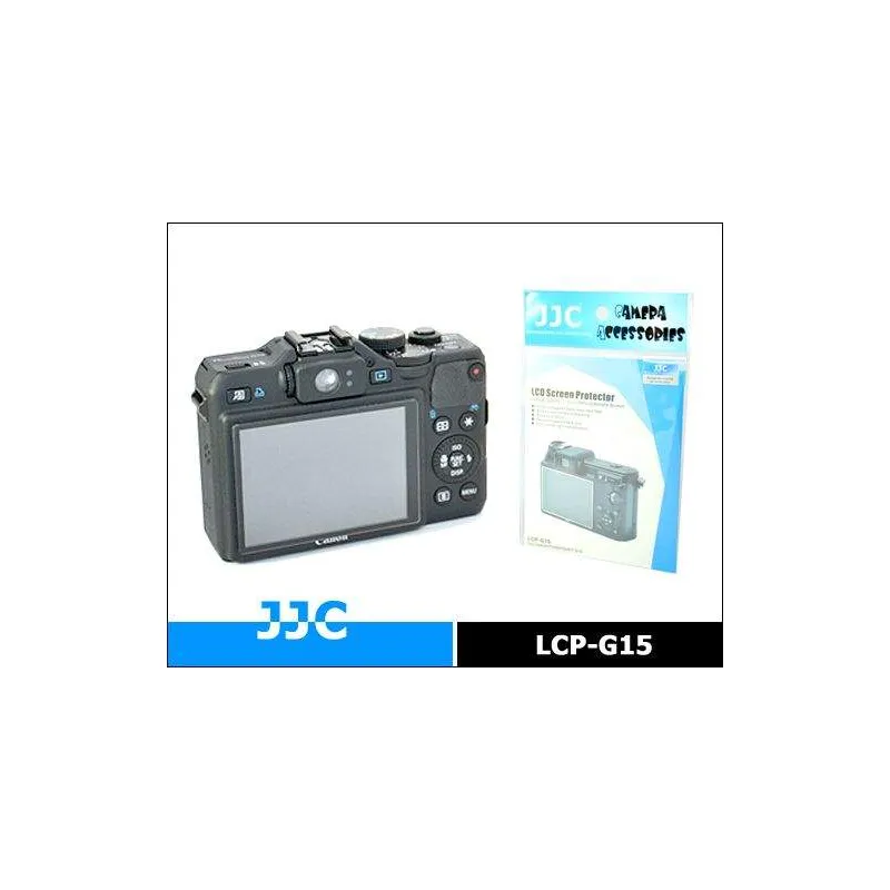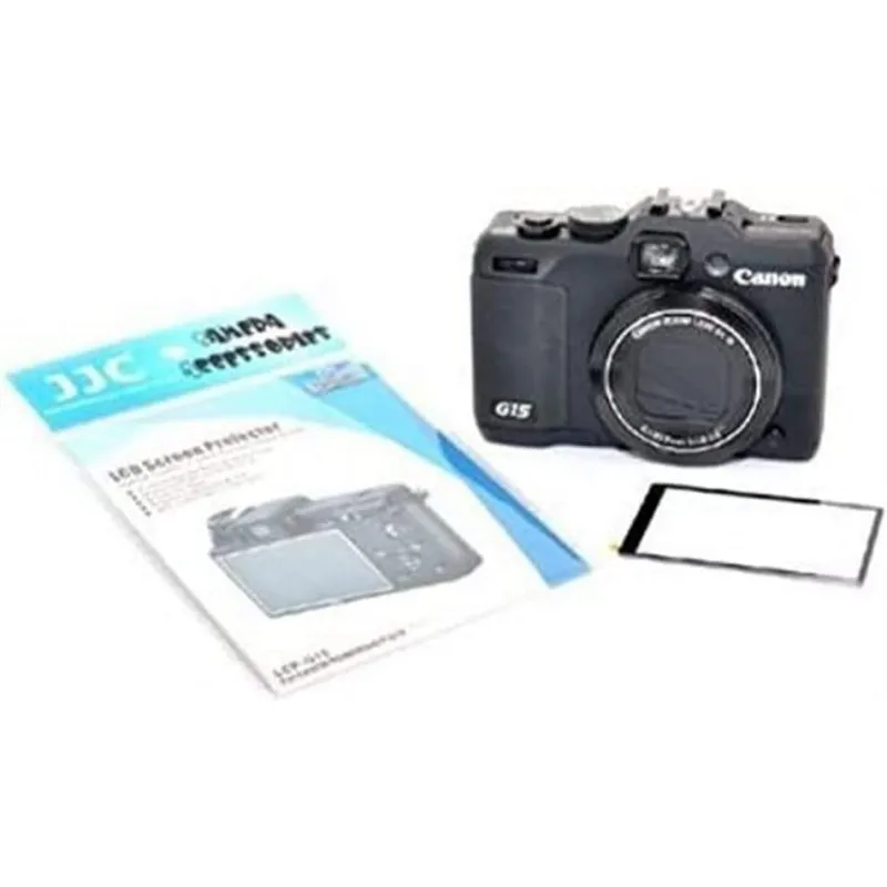 JJC LCP-G15 Ekrāna aizsargs Canon G15 LCD ekrāna aizsargs visiem Canon Powershot G15 kompaktajiem fotoaparātiem. Aizsargā kameras LCD ekrānu no netīrumiem, pirkstu nospiedumiem un skrāpējumiem. H5 pārklājums aizsargā arī pašu LCD vāciņu no skrāpējumiem! Plānais dizains nodrošina aptuveni 95 % gaismas caurlaidību; tas ir pietiekami daudz, lai apskatītu un izmantotu kameras izvēlni.