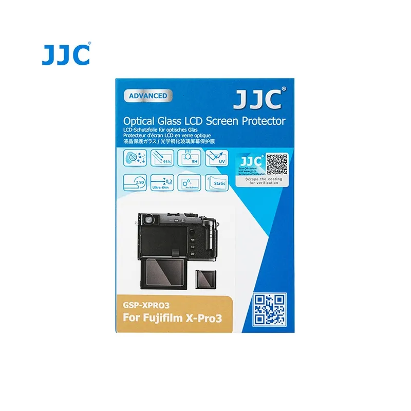 JJC GSP-XPRO3 optiskā stikla aizsargs Fujifilm X-Pro3 JJC GSP-XPRO3 optiskā stikla aizsargs ir īpaši plāns optiskā stikla slānis, kura biezums ir tikai 0,3 milimetri, lai aizsargātu jūsu kameras LCD displeju. Pateicoties tā 95% gaismas caurlaidībai, jūs saglabājat labu ekrānā redzamās informācijas un attēlu redzamību. Optimāla aizsardzība Daudzslāņu stikla aizsargs pasargā displeju no netīrumiem, skrāpējumiem, sviedriem, taukiem un pat krāsas maiņas, ko izraisa ilgstoša gaismas iedarbība. Stikls arī bloķē ienākošos UV starus, vienlaikus ļaujot cauriet redzamās gaismas spektram. Viegli piestiprināms Optiskā stikla aizsargs ir viegli piestiprināms, zem virsmas neveidojot gaisa burbuļus, un tikpat viegli atkal noņemams. Pateicoties statiskai piestiprināšanai, uz ekrāna nepaliek kaitinošas līmes paliekas. Komplektā ir iekļauti tīrīšanas līdzekļi, lai pirms aizsardzības uzklāšanas jūsu displejs būtu pēc iespējas tīrāks.