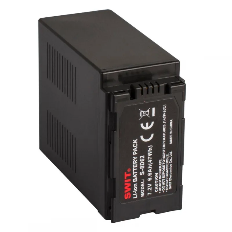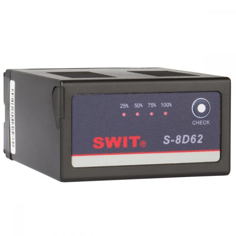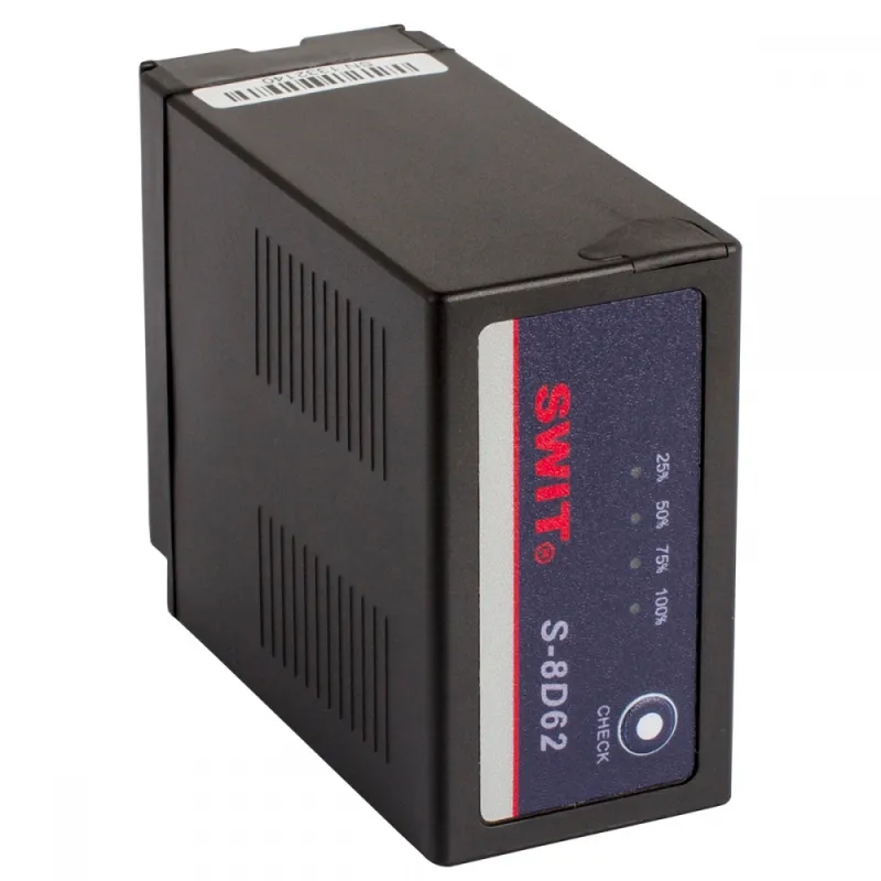 S-8D62 is a 7.2V, 47.5Wh Li-ion DV battery compatible with Panasonic CGA series D54S/D28S batteries. It has a 7.2V pole DC output socket for SWIT LED light S-2010, allows to power camera and light simultaneously. S-8D62 also has a 4-level LED indicator to give you a view of remaining power before mounting to camera. The build-in intelligent circuit has multiple protections of abnormal current, voltage and temperature.