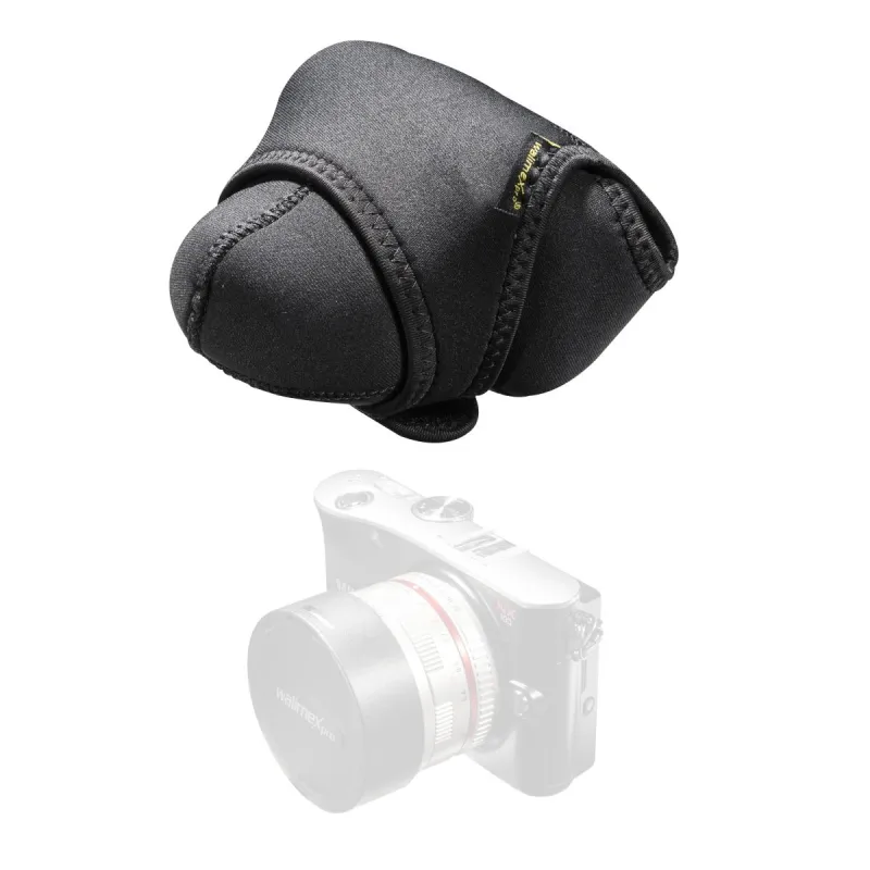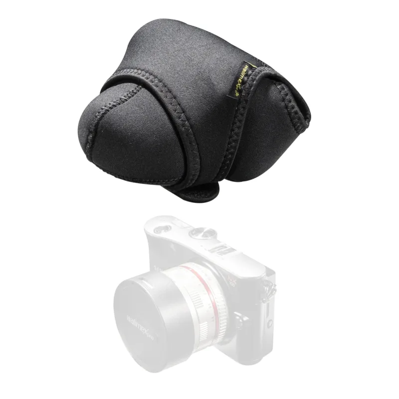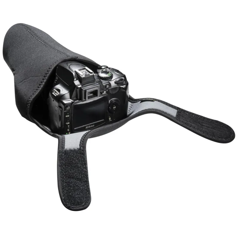 The walimex Camera Protection Cover in size M can be used quick and uncomplicated. Simply putted over your camera and closed with the Velcro fastener, you camera is protected against splash water, scratches and dust within seconds. As cuddly the Neoprene Cover is to your camera as cuddly is also the appearance to your liking: Because with the double-sided usable Cover you can use either the black or the grey side according to your taste. Due to the size of 18x14x12cm, the Neoprene Cover is suitable for medium SLR cameras with mounted lens.