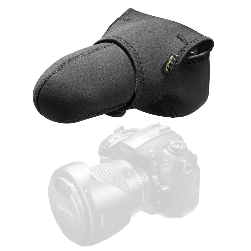 The walimex Camera Protection Cover in size L can be used quick and uncomplicated. Simply putted over your camera and closed with the Velcro fastener, you camera is protected against splash water, scratches and dust within seconds. As cuddly the Neoprene Cover is to your camera as cuddly is also the appearance to your liking: Because with the double-sided usable Cover you can use either the black or the grey side according to your taste. Due to the size of 23x16x14cm, the Neoprene Cover is suitable for big SLR cameras with mounted lens.