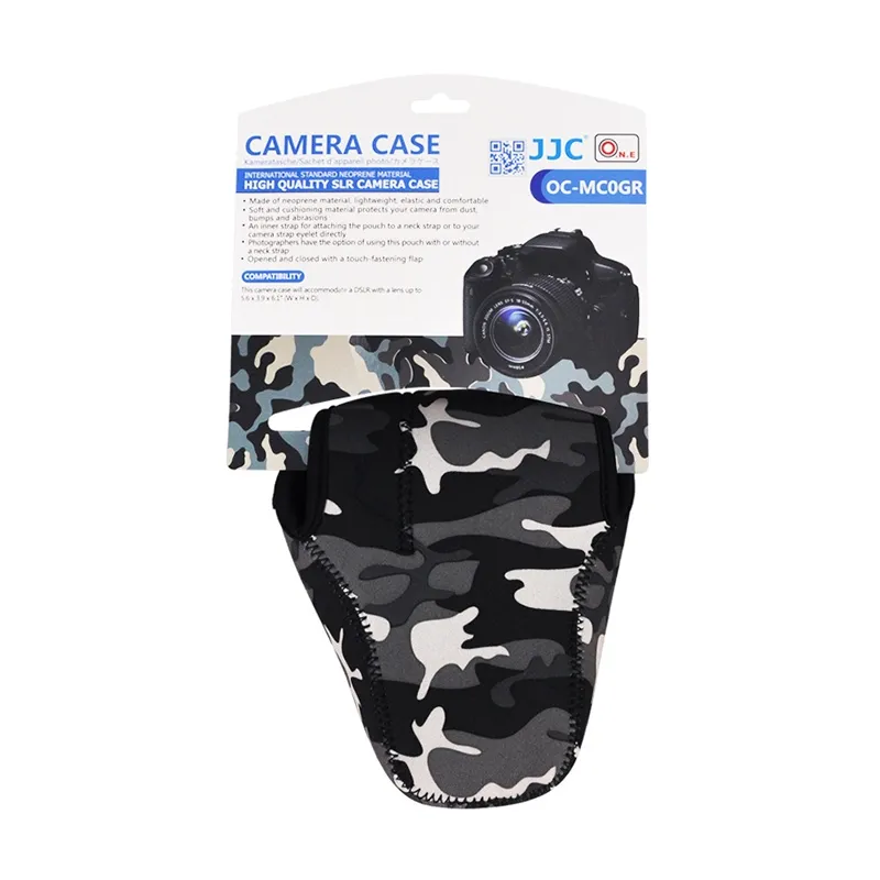 JJC OC-MC0GR neoprēna kameras pārvalks ir vienkārša neoprēna soma kompaktai DSLR kamerai ar 18-55 mm vai tilta kamerai. Pārsegs nodrošina lielisku aizsardzību pret netīrumiem, putekļiem, skrāpējumiem un triecieniem. Dizains ir vērsts uz lietošanas ērtumu un vieglu svaru. Tāpēc jūsu kamera ir ātri pieejama, un ir izmantots viegls materiāls, kas ir arī elastīgs. Somu ir iespējams piestiprināt ierīces kakla siksnai.