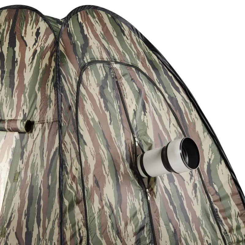Vēl viens akcents ir ieejas durvis, uz kurām aiz vizuālas aizsardzības ir paslēpts garš rāvējslēdzējs. Viltīgi atverot šo rāvējslēdzēju, jūs iegūsiet nepieciešamo vietu objektīva un statīva kājiņas ievietošanai. Ļoti ērtais dubultais rāvējslēdzējs noteikti būs bez nolietojuma pazīmēm pēc atkārtotas lietošanas. Turklāt teltij ir divi aptuveni 41x27 cm lieli sānu logi, kas ir aprīkoti ar aizslietņiem pret mušām, lai pasargātu no traucējošām mušām un nodrošinātu labu maskēšanos. Tādējādi nav problēmu nodrošināt nepieciešamo gaismu kameras vai tālskata regulēšanai. Piegādē ir iekļautas arī četras telts naglas, kas, piestiprinātas pie uzgaļiem un nostiprinātas zemē, nodrošina nepieciešamo stabilitāti un drošību pret vēju.