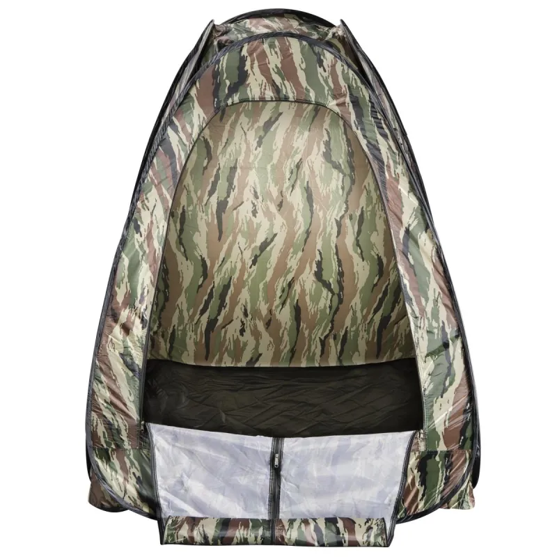 Mūsu kamuflāžas telti raksturo ļoti izturīga izgatavošana un augsta kvalitāte. Telti saņemsiet salocītu kamuflāžas/melnā pārnēsāšanas somā. Pēc atvēršanas nēsāšanas rāmis tiks izlocīts gandrīz bez jūsu aktīvas palīdzības. Šo tehniku jūs noteikti zināt no mūsu salokāmajiem atstarotājiem un gaismas kubiem. Nepieciešamība pēc kaitinošas telts poles vairs nav nepieciešama. Aptuveni 140 cm augstajā teltī var iekļūt caur durvīm, kuras var atvērt un aizvērt, izmantojot rāvējslēdzēju. Telts iekšpusē ir pietiekami daudz vietas, lai jūs un jūsu inventāru uz uzturēšanās laiku izvietotu ļoti droši un izturīgi pret laikapstākļiem.