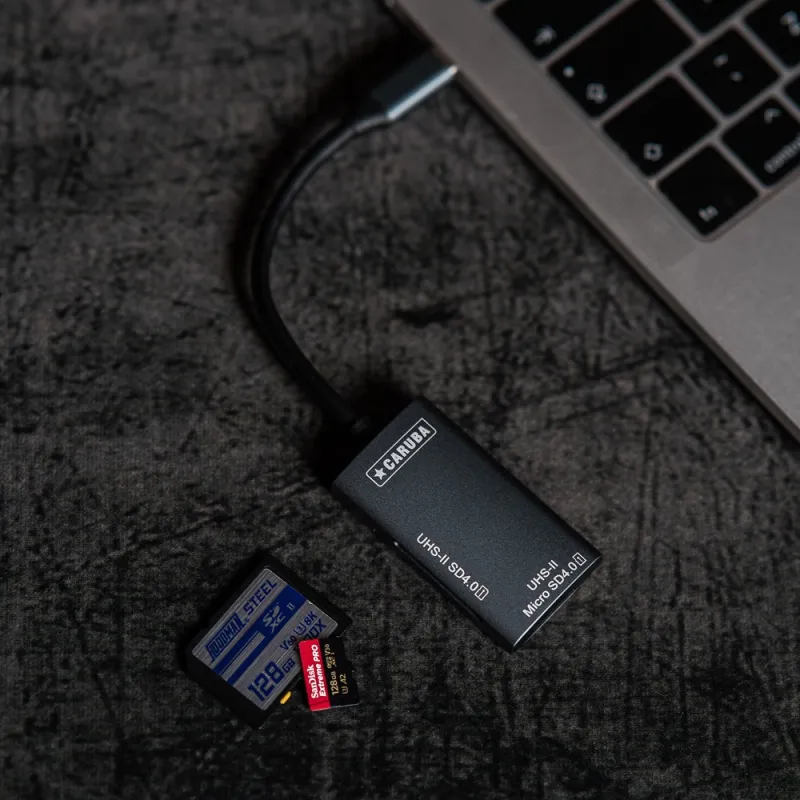 Caruba Cardreader SD 4.0 USH II Micro SD ļauj zibens ātrumā pārsūtīt failus no SD 4.0 USH II vai Micro SD kartēm uz datoru.