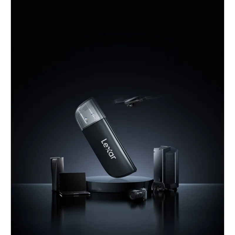 Lexar divu slotu USB-A lasītājs ļauj ātri pārsūtīt attēlus no SD un microSD kartēm uz datoru ar USB 3.2 Gen 1 pārraides ātrumu līdz 104 MB/s1. Tas ir stilīgs, pārnēsājams un atbalsta kartes ar ietilpību līdz 1 TB.