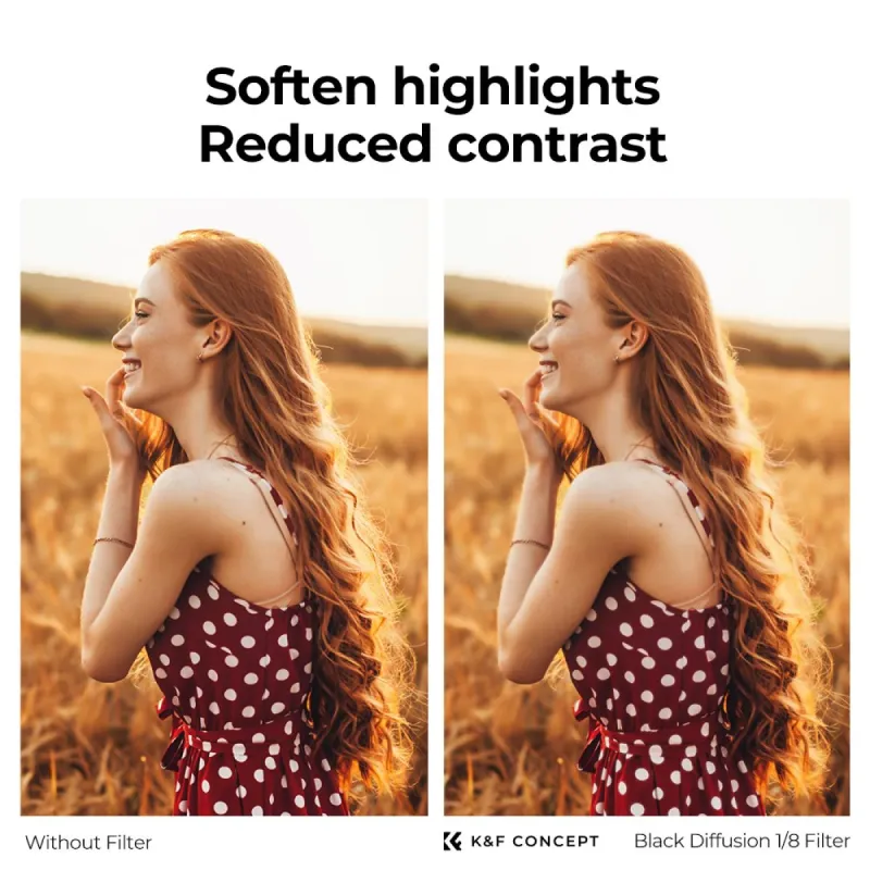 The K&F Concept Black Diffusion 1/8 Effect Filter is designed to create a dreamy cinematic effect, softening skin imperfections like wrinkles, freckles, and pores, resulting in a more delicate and captivating appearance. Its ideal for video shooting and portrait photography, enhancing the hazy film effect. With 28 multi-layer coatings, this filter is easy to clean thanks to its waterproof, scratch-resistant, and oil-proof coatings, all without compromising image quality. Crafted from Japanese AGC optical glass, the filters multiple coatings reduce transmittance to 87% while effectively minimizing surface reflections. The unique Nanotec double polishing process guarantees high-definition images within a 550mm focal length. Measuring 100x100mm, this square filter is compatible with most filter holders, and the package includes 1 filter and a leather filter bag for convenient storage.