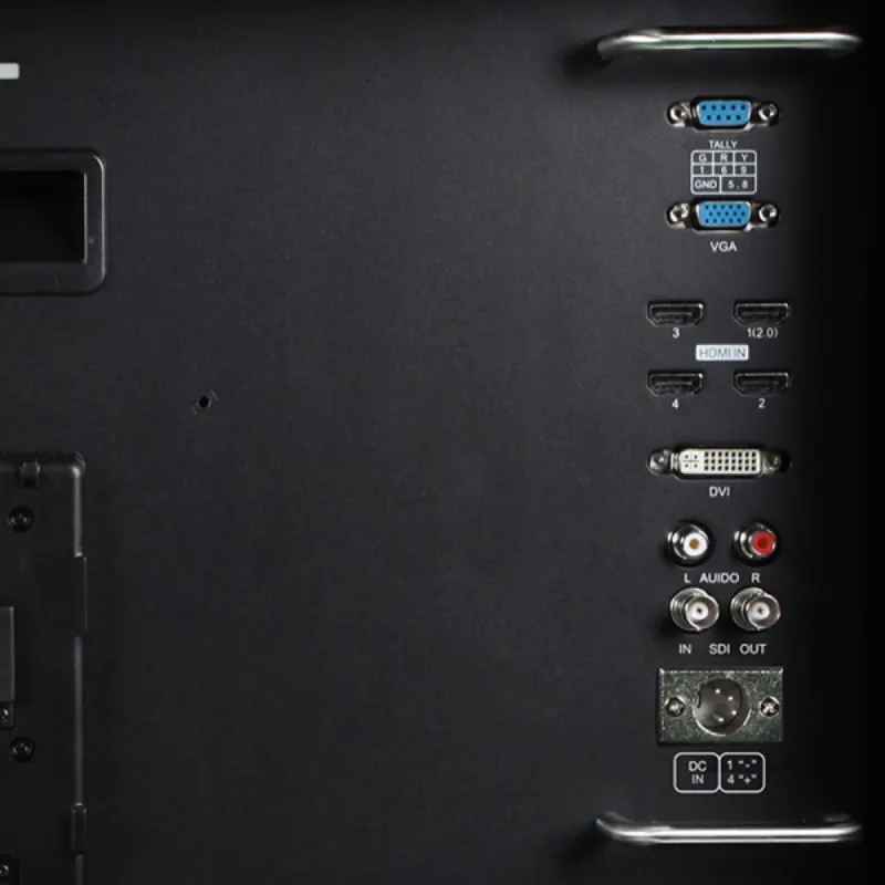 Wide view angle, 4K resolution (3840 x 2160), bright, colorful display HDMIX4, 3G SDI, DVI, VGA, Audio(L/R) inputs and 3G SDI loop through output Monitoring via front panel 3.5mm stereo headphone jack and built in speaker Built in LED tally indicators (Red, Green, Yellow)