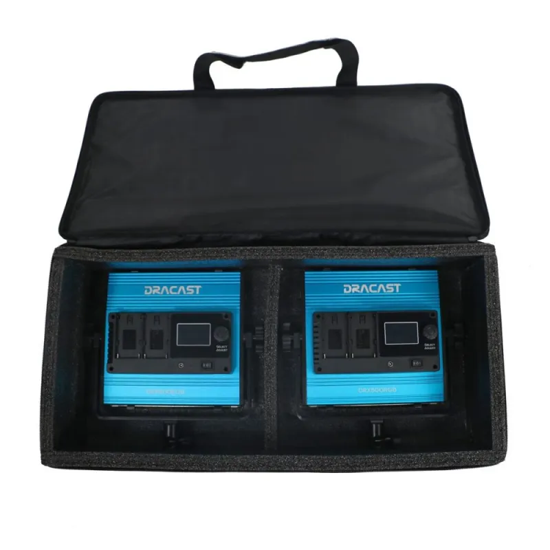 Dracast DRX2500RGBS LED apgaismojuma komplekts ietver divas gaismas, statīvus, barndurus un ceļojuma somu vieglai transportēšanai.