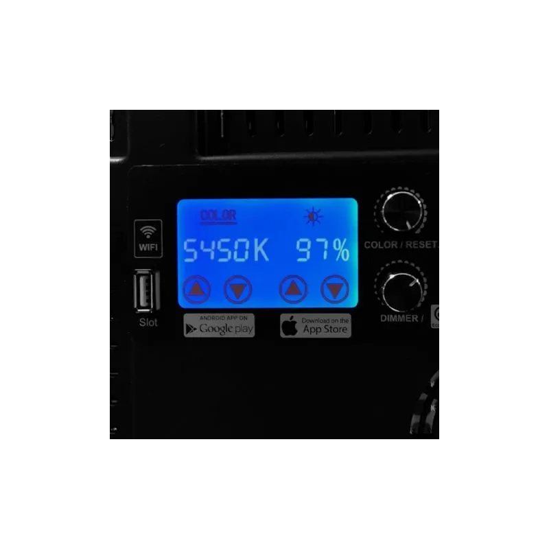 The Falcon Eyes Wi-Fi LED Lamp LPW-820TD is a dimmable LED lamp (49.2W). The panel has 820 small LED lights, which generate a color temperature of 3000 up to 8000K. The lamp can be operated with the control panel at the back of the lamp. The display is provided with a touch screen, what makes the lamp easy to control. You can use the lamp via AC power with the supplied power supply (15V 7A), but also with an optional V-mount battery.