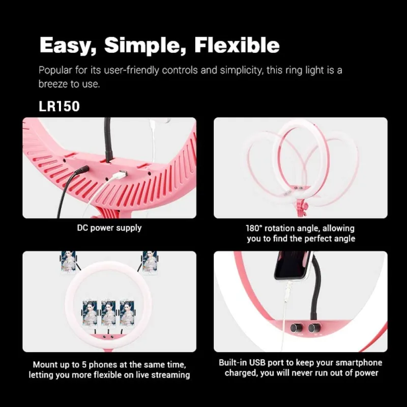 Krāsu un gaismas intensitāti var regulēt, izmantojot vienkāršu pogu uz statīva. LR150 darbojas ar USB barošanu, kas nozīmē, ka to var ņemt līdzi jebkur un darbināt ar datoru, klēpjdatoru vai strāvas adapteri.