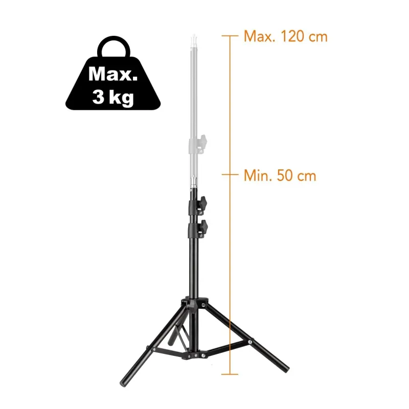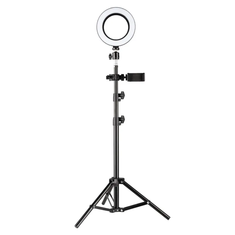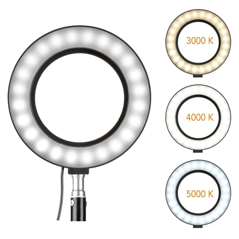 Komplektā iekļautajā 6 vatu gredzenveida gaismā ir 24 gaismas diodes silti baltai gaismai un 24 LED vēsai baltai gaismai. Krāsu temperatūra tiek iegūta, sajaucot dažādas gaismas diodes, un to var regulēt trīs pakāpēs no 3000 K (mākslīgā gaisma) līdz 5000 K (dienas gaisma). Spilgtumu var samazināt 10 soļos. Barošana tiek piegādāta caur USB. Lampa ir piestiprināta pie statīva augšdaļas ar vītņoto skrūvi caur lodveida galvu. Tas ļauj viegli to novietot ideālā stāvoklī. Gredzenveida lampas gaisma rada gredzenveida atspulgus acī, kas tiek uztverta kā ļoti patīkama.