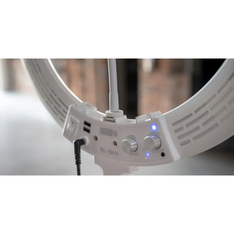 Newell RL-18A - WB (3200 K - 5500 K) - Arctic White LED gredzenveida gaismai ir iebūvēts izkliedētājs, kas nodrošina dabisku un maigu gaismu bez papildu piederumiem. Ar ergonomiskām metāla pogām var regulēt jaudu un krāsu temperatūru. Pateicoties gredzenveida dizainam, lampa nodrošina vienmērīgu gaismas sadalījumu gan uz modeļu, gan objektu sejām.