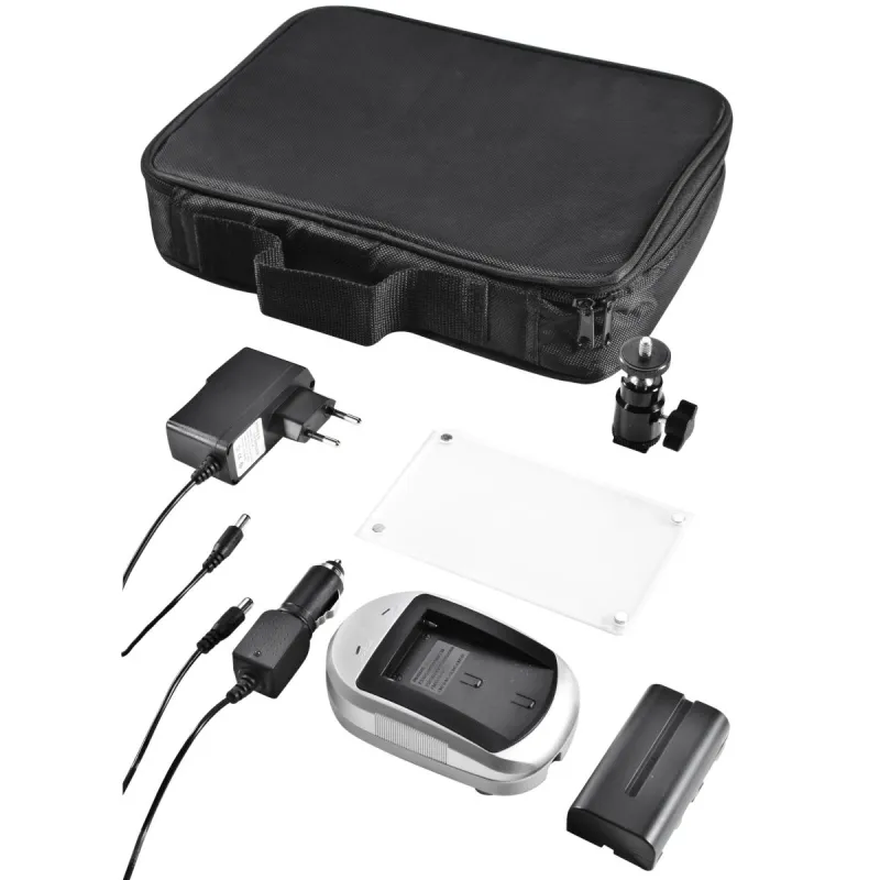 The LED light with its high quality plastic casing is ideal for mobile use as it is very lightweight. It can be powered with a battery or with the power cord directly. This is ideal when recording for longer periods of time, and it is also fully useable when the battery is dead or you forgot to bring the charger. For charging the battery, a charger is included, as well as a 12V car cable which allows you to charge the battery via the cigarette lighter in your car. For protecting your equipment, a padded transport bag is included.