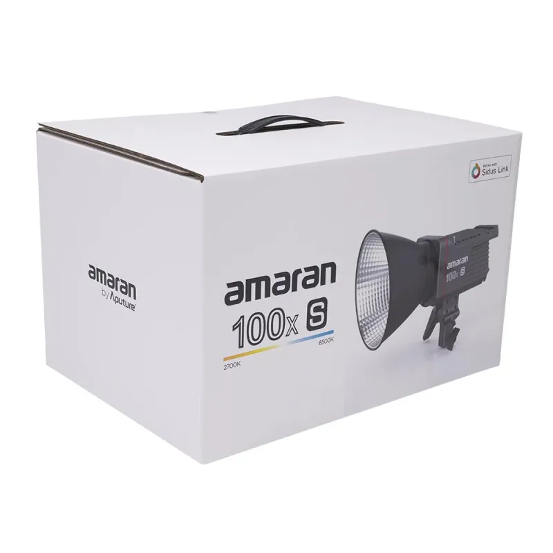 The Amaran 100x S is a 100W multi-purpose LED lamp. It is the successor to the highly regarded Amaran 100x model, featuring an improved chipset. State-of-the-art technological solutions guarantee even better light quality. The unit allows you to adjust the colour temperature from 2700 K to 6500 K. It also comes with a Hyper Reflector canopy, which makes it possible to focus the light beam and thus increase its intensity. Convenient operation of the unit is provided by a control panel with a large LCD display. The lamp can also be controlled remotely using the Sidus Link mobile app. Main product features 100 W LED lamp successor to the highly acclaimed Amaran 100x model even better LED chipset for more accurate colour reproduction CRI: 95+ / TLCI: 97+ / CQS: 97+ / TM-30 RF: 96 / TM-30 RG: 102 / SSI (D56): 87+ / SSI (D32): 89+ adjustable light colour temperature from 2700 K - 6500 K impressive luminous flux of 8788 lm possibility of achieving a light intensity of 30500 lux (at a distance of 0.5 m using the Hyper Reflector Mini canopy and a colour temperature of 5600 K) bright and easy-to-read LCD display support for the Sidus Link mobile app control via smartphone or tablet from a distance of up to 80 metres 9 preset special effects (including broken bulb, TV, explosion, strobe) ambrella hole integrated into the flash infinitely adjustable brightness and colour temperature of the light via a knob hyper Reflector canopy included Big power Thanks to a state-of-the-art chipset with two LEDs, the 100 W lamp produces light with a strength comparable to a traditional 750 W tungsten bulb. The unit generates a luminous flux of 8788 lumens. The combination of the lamp with the Hyper Reflector canopy and a colour temperature setting of 5600 K allows to achieve a light intensity of up to 149200 lux from a distance of 0.5 m! Top quality light The Amaran 100x S is a refreshed version of the well-received Amaran 100x 100-watt lamp, designed with video makers and photographers in mind. This model is based on an improved LED chipset that provides excellent light quality and unparalleled accuracy in colour rendering. This is confirmed, among other things, by the high SSI ratings of D32 (89+) and D56 (87+). With such parameters, the lamp can compete with much more expensive models of equipment used in the world of professional video production. Colour temperature adjustment Adjusting the colour of the light emitted by the lamp to the conditions found on set can sometimes be a challenge. Working with the Amaran 100x S LED lamp will certainly make this task easier. The device allows you to instantly set the desired colour temperature in the range of 2700 K to 6500 K. Adjusting the colour knob will allow you to set the desired colour temperature. The rotary control allows you to instantly adjust the light to suit your current needs. You can also do it from the mobile app. For creative creatives The Amaran 100x S LED lamp will successfully prove itself on film and photography sets, in the home studio, as well as wherever you come to record vlogs, streams or live broadcasts. Perfect colour reproduction ensures that the skin of the characters you film will always look natural. The new chipset used in the Amaran 100x S will give you even more versatility when working, filling rooms with the highest quality light. Sidus Link app Sidus Link technology gives filmmakers tremendous possibilities, allowing you to control individual Amaran and Aputure lamps or groups of these devices from your smartphone. The Sidus Link app will give you access to all lamp functions, as well as allowing you to modify standard settings and save your own. Lamps running on the Sidus Mesh system can connect to each other, which increases the range of the entire network, giving you great freedom when working with light. Special effects The Amaran 100x S offers 9 built-in special effects that allow you to simulate paparazzi flashes, fireworks, a broken light bulb, lightning strikes, TV, pulsating light, flashes and explosions, among others. With these, you can add a wow effect to your videos without having to increase your production budget. Bowens mount The LED lamp presented here supports the popular Bowens standard, used for mounting light modifiers popular in the world of film and photography. Hundreds of accessories, such as gates, canopies, softboxes, grids or injectors are waiting to be connected to the Amaran 100x S. The icing on the cake is the umbrella hole, which you will find on the mount integrated into the lamp. Compact design In a fast-paced world, time is at a premium. The Amaran range of products is designed to allow you to work efficiently. The small size and weight make these lamps extremely user-friendly and transportable. You can easily mount the Amaran 100x S model on a tall lighting tripod or pole, and easily pack the unit into a regular camera bag after the shoot. The whole set weighs just over 3 kg! Specification model: Amaran 100x S light colour temperature: 2700 K - 6500 K CRI: 95+ TLCI: 97+ CQS: 97+ TM-30 RF: 96 (averaged value) TM-30 RG: 102 (averaged value) SSI (D56): 87+ SSI (D32): 89+ maximum output power: 100 W maximum power consumption: 113 W luminous flux: 8788 lm Angle of illumination: without modifier: 110.4º with Hyper Reflector: 17.9º Power supply: DC: 48 V / 2.5 A AC: 100 V - 240 V / 2.7 A Allowed operating temperature: -10°C - 40°C Control: lamp control panel Sidus Link application maximum remote control range: 80 m (Bluetooth) display: LCD cooling: active Dimensions: lamp without mounting bracket: 207 x 115 x 115 mm lamp with mounting bracket: 207 x 119 x 200 mm power supply: 137 x 59 x 36 mm power cable: 300 cm weight: lamp: 1.42 g power supply: 490 g whole kit: 3.287 kg Kit contents Amaran 100x S LED lamp Hyper Reflector canopy with Bowens mount protective shield power cable power supply photometry CCT Distance No modifier Hyper Reflector 2700 K 1 m 2760 lx 22470 lx 3 m 324 lx 2422 lx 5 m 126 lx 