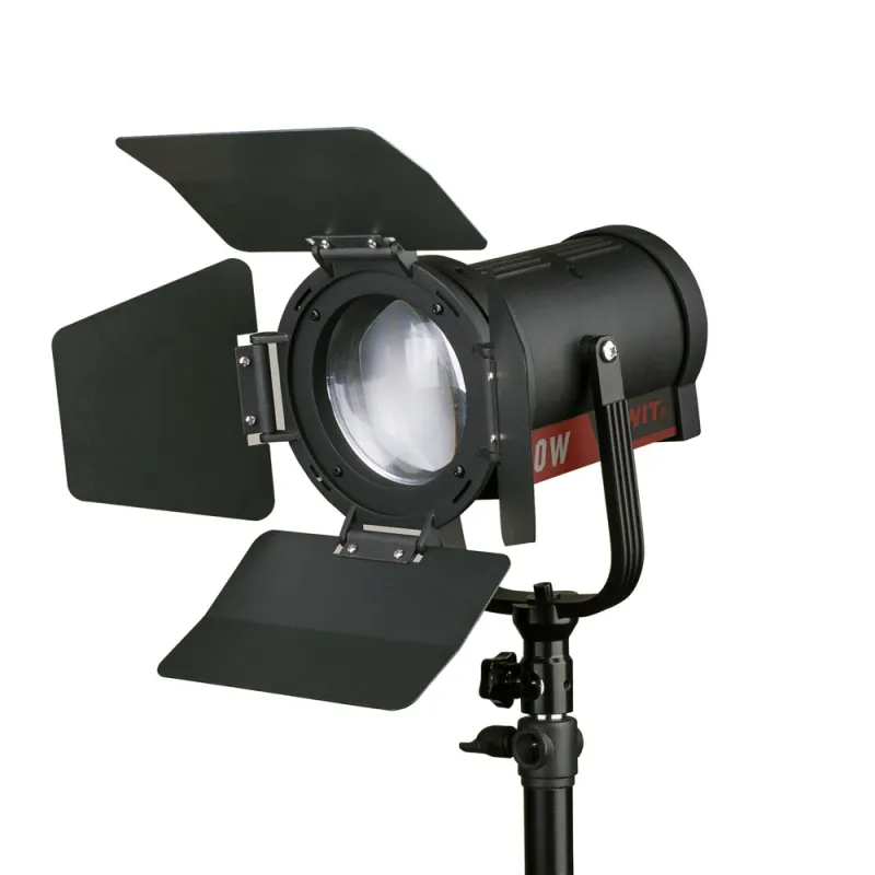 FL-C60D portable LED spot light adopts Chip-On-Board LEDs of 50,000 hours lifetime, 60W power, bi-color, DMX adjusting focus angle, as the key light of interview light kit or field video productions.