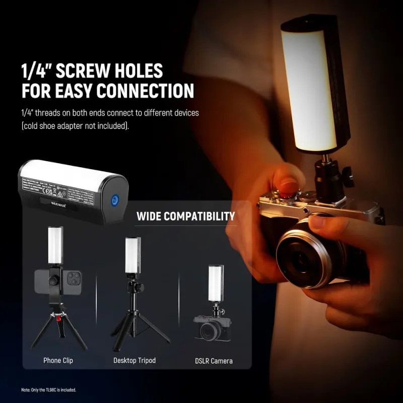 Ar 360 RGB krāsu riteni, TL98C RGB magnētiskā rokas gaismas nūja ir ideāla vlogging, tiešsaistes straumēšanai, selfijiem un citiem radošiem pielietojumiem. Darbojoties ar uzlādējamu akumulatoru, šī 4.3" magnētiskā LED nūja var tikt turēta rokās vai izmantota jebkur. Gaisma piedāvā paplašinātu CCT krāsu diapazonu no 2500 līdz 10,000K ar CRI un TLCI novērtējumiem 97 precizitātei. Citas iezīmes ietver zaļās-magentas pielāgošanu krāsu kalibrēšanai. TL98C arī piedāvā uz vietas un lietotnes kontroli, lai viegli piekļūtu 17 īpašiem efektiem interesantu apgaismojuma simulāciju radīšanai. Kompakta, bet ļoti jaudīga, TL98C nodrošina bezvadu DMX. Izmantojiet tās HSI režīmu, kas izmanto RGB krāsas, lai nodrošinātu pilna spektra krāsu izvadi.