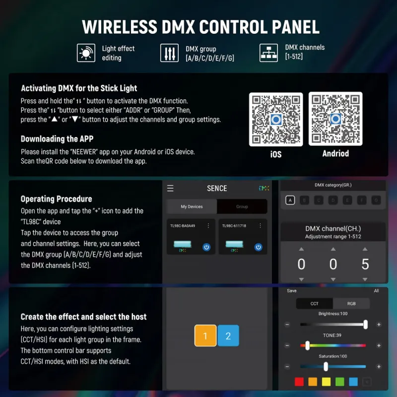 Izmantojiet Neewer lietotni, lai bezvadu veidā kontrolētu gaismu no līdz pat 59 m attāluma. Ātri kontrolējiet gaismas iestatījumus, piemēram, intensitāti, krāsu temperatūru, toni/saturāciju un ainas, un saglabājiet priekšstatu bez sarežģījumiem. TL98C arī atbalsta bezvadu DMX iestatījumus, izmantojot lietotni, lai programmētu apgaismojuma efektus, kā arī līdz astoņām grupām, katra atbalsta līdz 128 gaismām efektīvai grupas kontrolei.