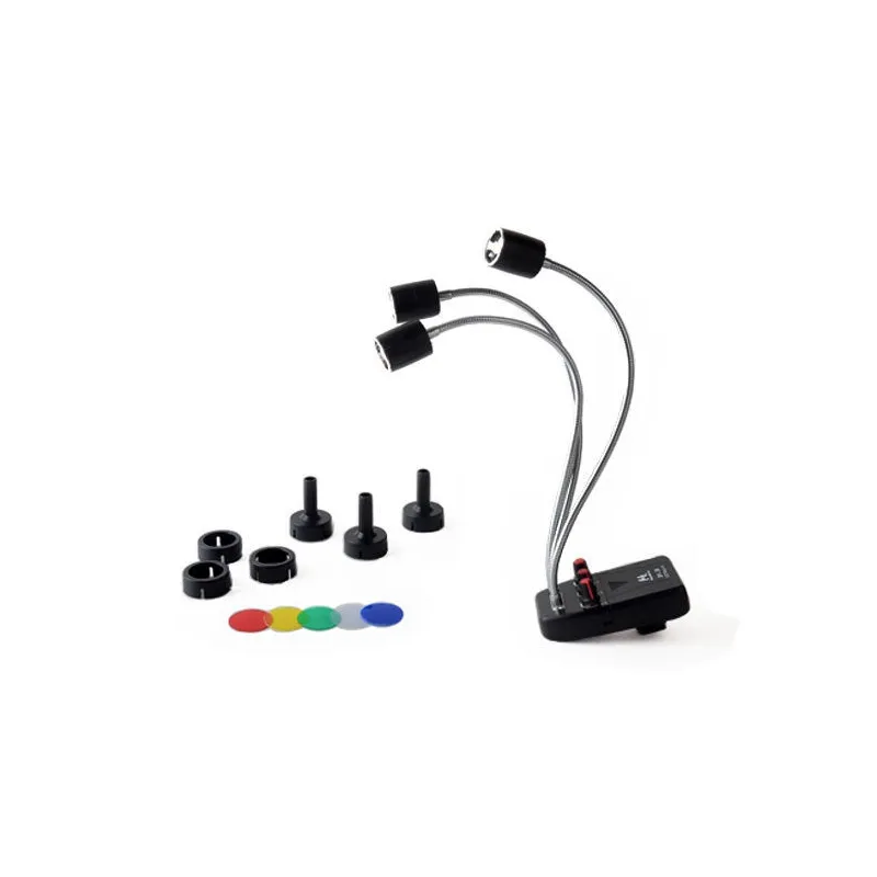 Falcon Eyes makro LED lampa DV-3B; 4 x krāsu filtrs sarkans; 4 x krāsu filtrs dzeltens; 4 x krāsu filtrs zils; 4 x krāsu filtrs caurspīdīgs; 4 x krāsu filtrs zaļš; 4 x krāsu filtrs zaļš; 3 x fokusa vāciņi
