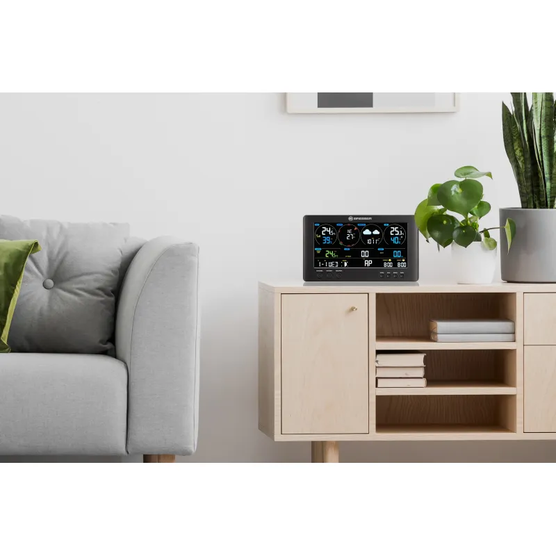 The new BRESSER WIFI ClearView Weather Station with 7-in-1 sensor offers a very comprehensive range of weather data. The multifunctional outdoor sensor can easily be installed with the included mounting accessories! The outdoor sensor reliably transmits measured values for wind speed, wind direction, humidity, temperature, precipitation , as well as UV level and light intensity via 868 MHz frequency to the base station. The base station shows a large variety of current and historical local weather data on its 8.3'' TRUE BLACK colour display . The latter allows internal storage and evaluation of the measurement data over a period of 24 hours. A very reliable forecast for the upcoming 12h is calculated by your local weather data which will be displayed on the base station.