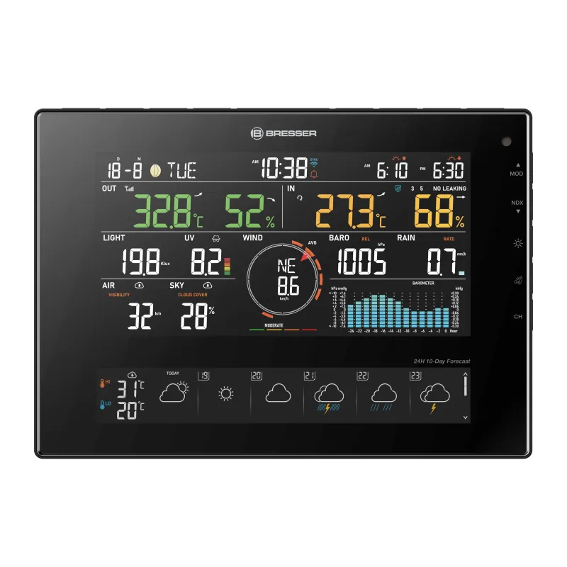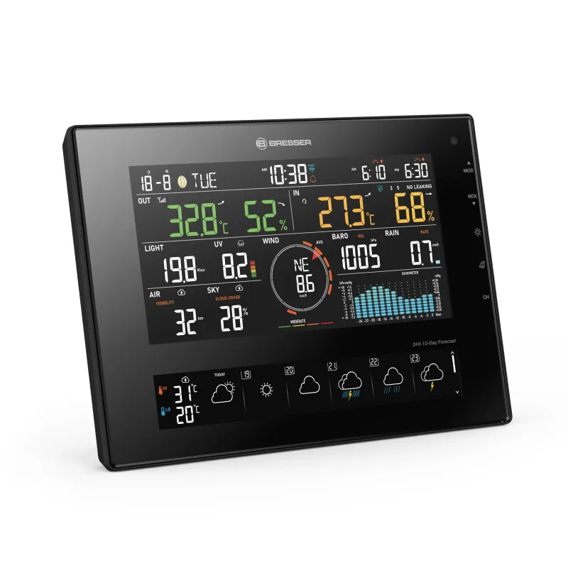 Ar BRESSER 11 dienu 4Cast CV WiFi laikapstākļu staciju 7-in-1 jūs vairs nekad neatradīsieties aukstumā laikapstākļu dēļ. Laika stacija ar 7-in-1 saules āra sensoru papildina uz vietas pieejamos datus ar daudz praktiskas informācijas no ProWeatherLive platformas. Īpašs akcents: plaša laikapstākļu prognoze, kas ietver prognozi nākamajām 11 dienām un detalizētu pārskatu par nākamajām 24 stundām. Informācija par vietējo redzamību un mākoņu segumu palīdz arī kaislīgiem meteorologiem amatieriem rūpīgi sekot līdzi laikapstākļiem. Jūs vienmēr būsiet lietas kursā, lai kur un kad jūs atrastos - izvēlieties, vai datus, tostarp maksimālās/minimālās vērtības, varat ērti apskatīt pārredzamāmeteoroloģiskās stacijasdisplejā, ProWeatherLive lietotnē vai tīmekļa pārlūkprogrammā.