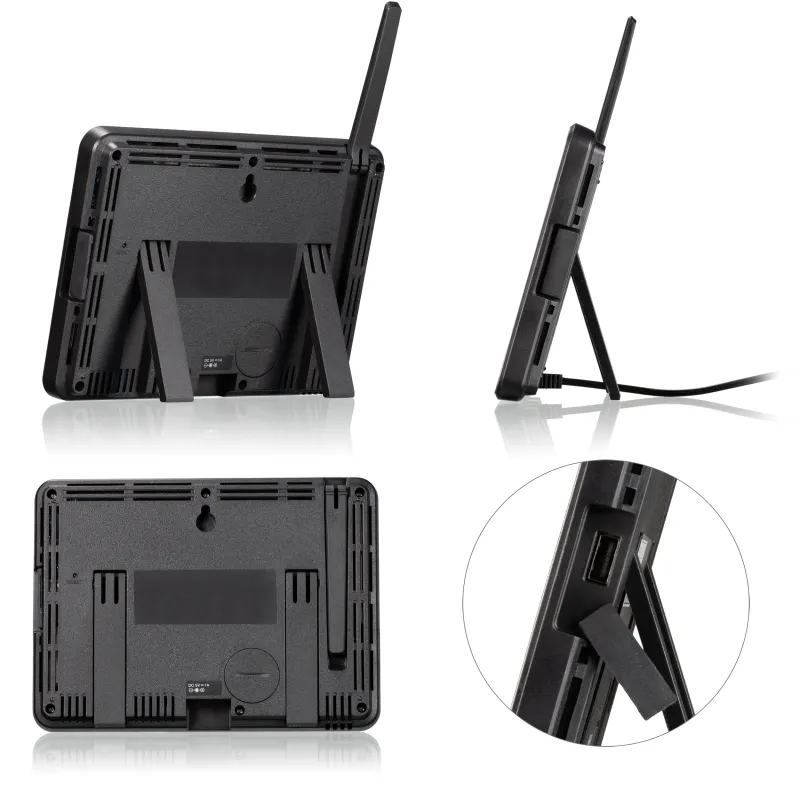 Uzstādīšanas iespējas: Var novietot uz galda ar iebūvētu statīvu vai piestiprināt pie sienas.