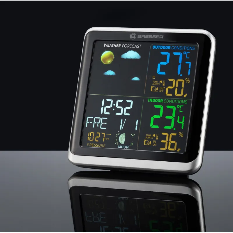 Šai BRESSER meteoroloģiskajai stacijai ClimaTemp TB ir pārskatāms krāsu displejs, kas sadalīts 4 zonās. Labajā pusē tiek parādītas izmērītās vērtības iekšpusē un ārpusē. Tādējādi jums vienmēr ir redzama temperatūra un mitrums. Laika prognoze nākamajām 12 stundām tiek aprēķināta pēc izmērītajām vērtībām un tiek attēlota grafiski kreisajā augšējā stūrī. Var attēlot sešus dažādus laikapstākļu veidus. Protams, tiek rādīts arī pašreizējais laiks, ko pārraida DCF radio signāls, datums, nedēļas diena un mēness fāze. Turklāt var iestatīt divus modinātāja laikus un pēc modinātāja zvana ar pogas nospiešanu aktivizēt atlikšanu. Laikapstākļu staciju var darbināt ar baterijām vai ar komplektā iekļauto maiņstrāvas/līdzstrāvas adapteri. Izmantojot baterijas, aizmugurējo apgaismojumu var aktivizēt ar snaudas atlikšanas pogu uz 7 sekundēm.