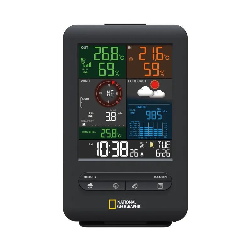 National Geographic krāsu displeja meteoroloģiskās stacijas jaunais dizains pārsteidz ar izcilu veiktspēju un lielisku cenas un kvalitātes attiecību. Meteoroloģiskā stacija apvieno kompaktu dizainu un visaptverošu informācijas pakalpojumu. Jaunais, unikālais krāsu displejs piedāvā skaidru informāciju un ideālu pārskatu elegantā dizainā.