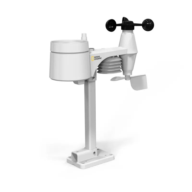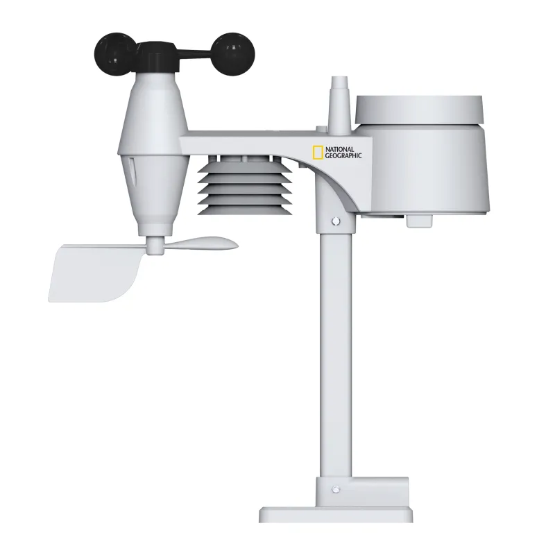 Daudzfunkcionālo āra sensoru ar ļoti kompakto dizainu var uzstādīt gandrīz jebkurā vietā. Piegādes komplektācijā jau ir iekļauts cauruļu skava un skrūves piestiprināšanai pie mastiem (caurules diametrs aptuveni 25-33 mm), kā arī statīvs montāžai līmenī! Āra sensors "5-in-1" uz bāzes staciju droši pārraida izmērītās vēja ātruma, vēja virziena, mitruma, temperatūras un nokrišņu daudzuma vērtības. Bāzes stacijas displejā var nolasīt ne tikai šīs vērtības, bet arī dažādus vēstures datus. Pēdējie ļauj iekšēji saglabāt un novērtēt mērījumu datus 24 stundu periodā. No apkopotajiem mērījumu datiem meteoroloģiskā stacija aprēķina ļoti ticamu vietējo laikapstākļu tendenču prognozi nākamajām 12 stundām, ko displejā attēlo seši grafiski simboli. Maksimālajām un minimālajām vērtībām var individuāli ieprogrammēt trauksmes signālu, kas, sasniedzot norādīto vērtību, iedarbina gan skaņas, gan gaismas signālu. Ja āra temperatūra ir no -3 °C, var aktivizēt arī īpašu sala/apledojuma brīdinājuma signālu. Slikts iekštelpu klimats var apdraudēt veselību, jo īpaši bērnu un vecāka gadagājuma cilvēku veselību. Šim nolūkam National Geographic meteoroloģiskā stacija piedāvā arī gudru funkciju. Telpas klimata indikators vienmēr informē par telpas klimatu, izmantojot simbolu.