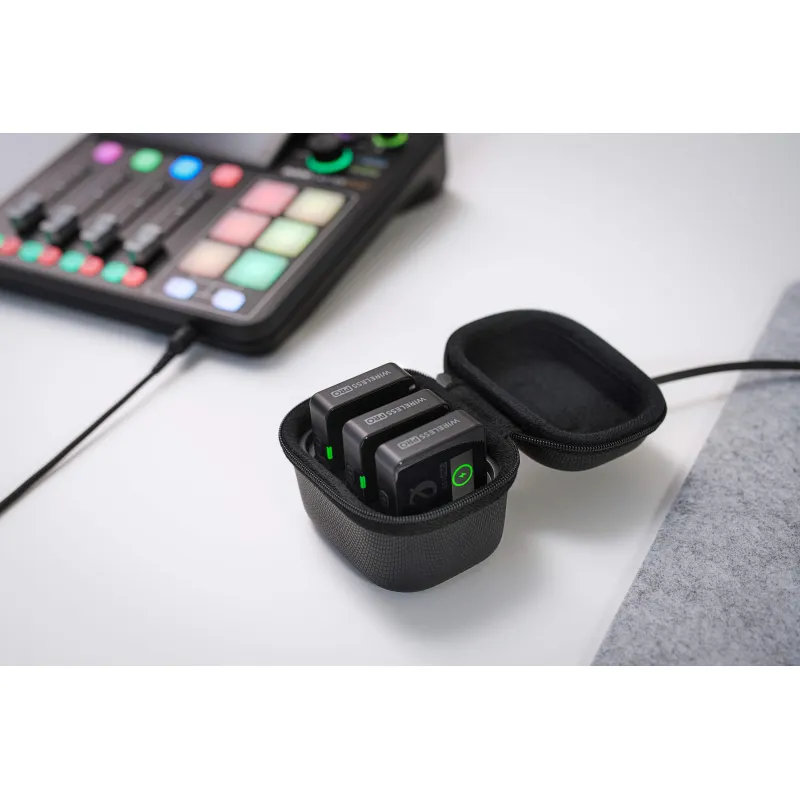 • Pilns piederumu komplekts, tostarp viedā uzlādes kārba, divi Lavalier II mikrofoni, kabeļi, MagClip GO magnētiskā stiprinājuma klipsis un piederumu kārba.