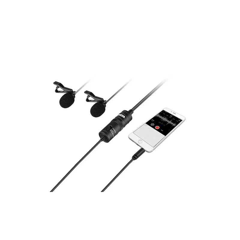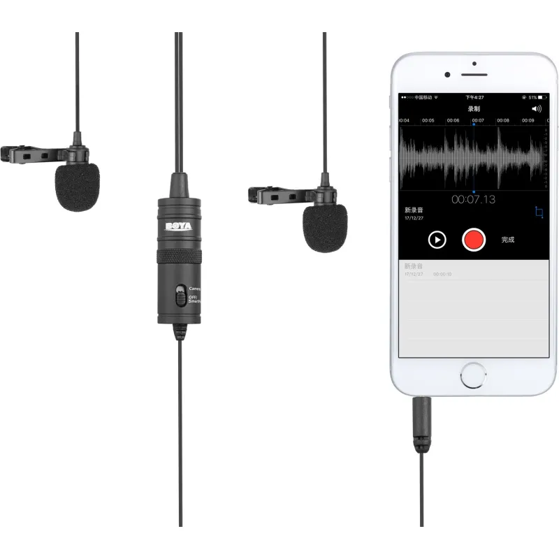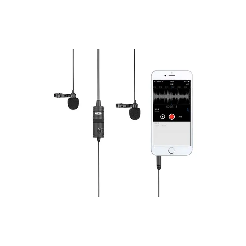 Boya BY-M1DM ir Dual Lavalier universāls mikrofons ar vienu 1/8" stereo savienotāju, to var izmantot ar viedtālruņiem,