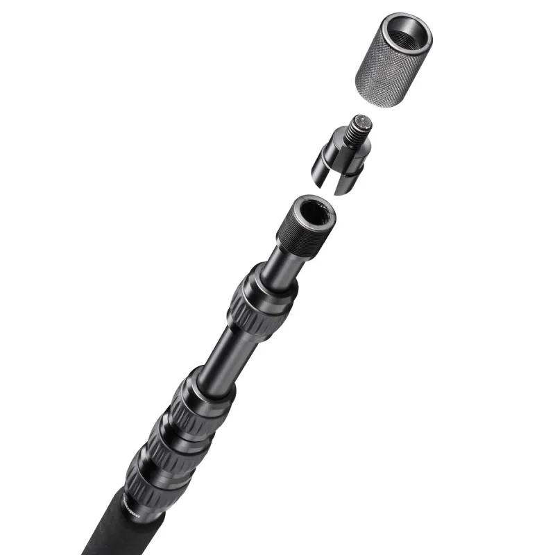 The boompole is most suitable for any video production, for which an external microphone is used. With its weight of 0.7 kg the boompole is very light and can be held stable even over longer periods of time. It can be directed to the speaker from above, without the microphone being visible in the picture. The sound engineer is able to simply work the arm, which can be infinitely extended up to 300 cm. The neoprene protection thereby prevents the transfer of noises from the operator and the boompole can be held comfortably. The cables are directly routed through the boompole and are thus securely stowed away. It can obviously also be mounted on a tripod, using a separately available clamp. For transport the boompole can be retracted to compact 80 cm.