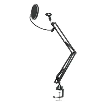 Ar šo galda mikrofona turētāju, kas izgatavots no augstas kvalitātes alumīnija, nekas netraucē sasniegt nevainojamus skaņas rezultātus. Regulējamais mikrofona turētājs ir piemērots visu veidu skaņas ierakstīšanai ar mikrofoniem ar 3/8" vai 5/8" pieslēgumu, piemēram, straumēšanai, podkāstiem, sociālo mediju videoklipiem, mūzikas ierakstīšanai utt. Turētājam ir pieejami plaši piederumi, piemēram, popfiltrs tīrai skaņai, mikrofona vējstikls un kabeļu turētāji. Mikrofona priekšā esošais popfiltrs aizsargā mikrofonu no plosīšanās trokšņiem, novēršot līmeņa pārslodzi. Papildus pievienotais elastīgais vējstikls no speciālām putām aizsargā pret vēju un mitrumu (piemēram, spļāvieniem). Čuguna skava un gumijots statīvs nodrošina drošu pamatu.