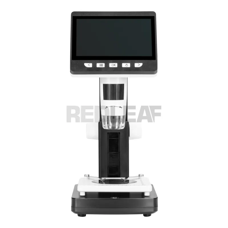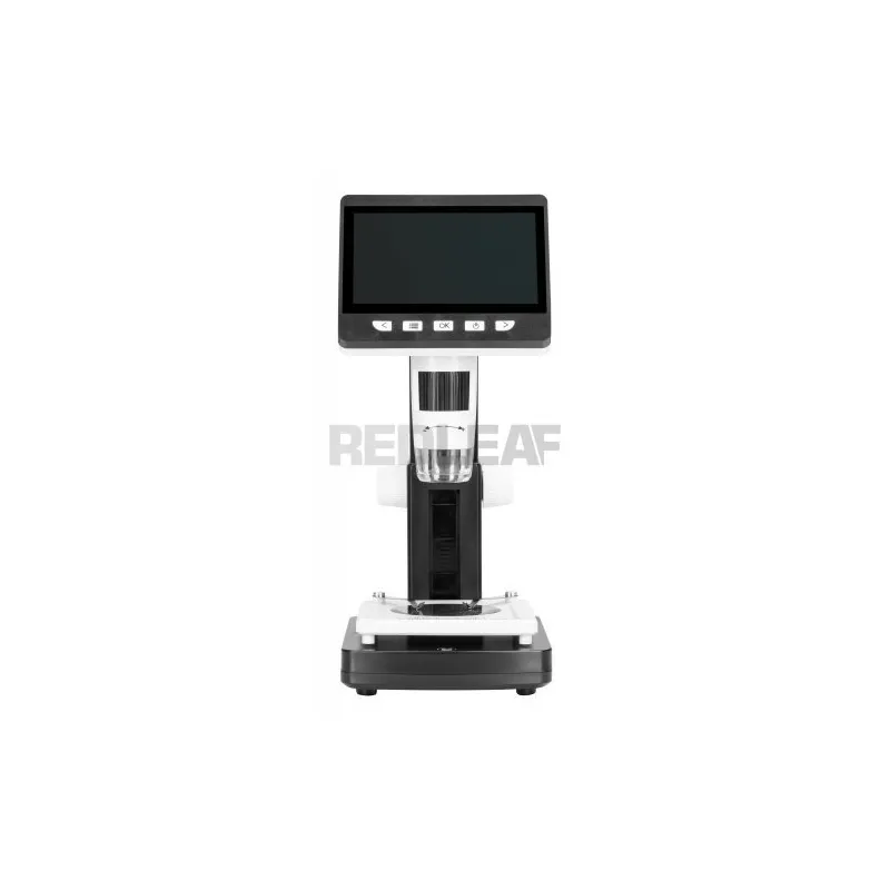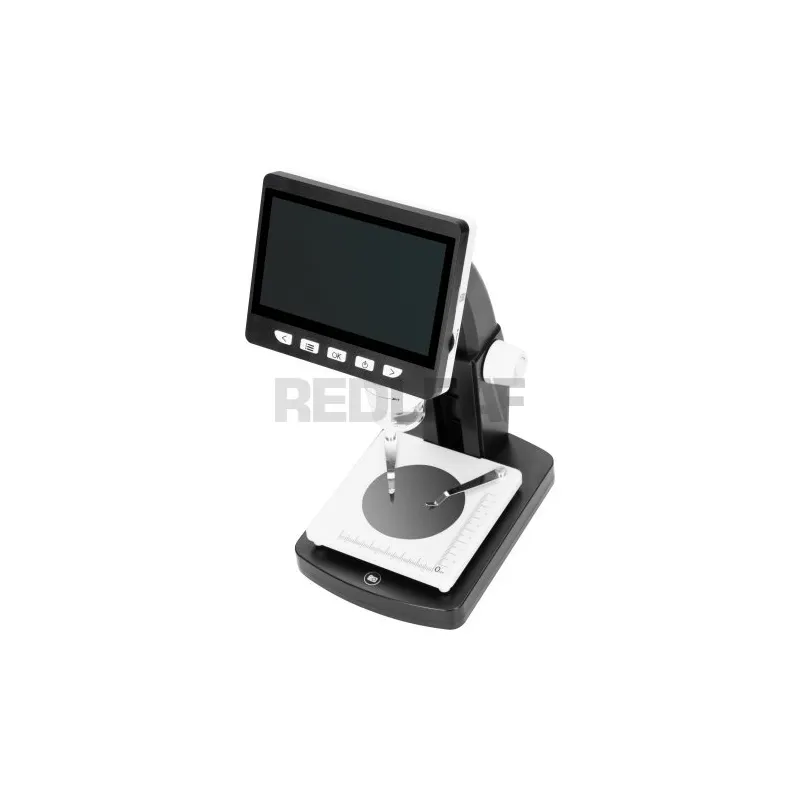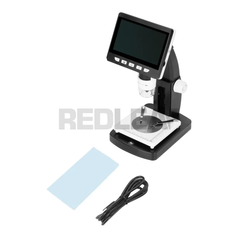 Convenient handling The shape of the Redleaf RDE-71000M resembles traditional microscopes found in professional laboratories. All the adjustment knobs are within easy reach, so it only takes a few seconds to find the optimal position. The tested preparations and objects are immobilized by means of metal grips. Once the moving table is set at the correct height, all you need to do is adjust the focus. The traditional eyepiece, which many people will remember from their biology lessons, has been replaced by a 4.3-inch LCD screen. In addition, in the lower part of the microscope housing there is a dedicated button that allows you to take a picture or record a movie with a single click. More than one screen The Redleaf RDE-71000M digital microscope offers a 1000x zoom to see the smallest details of objects viewed on a 4.3-inch LCD screen. Using the micro USB port, we can connect the device to a computer, on which we use dedicated software. The housing of the microscope also includes a micro HDMI port, which allows you to display the enlarged image on a monitor or TV screen. Photos and videos can also be saved directly on the microSD card. Control from the screen level The integrated screen is not only a convenient real-time view. Using the physical buttons underneath the display, you can set many image parameters. These include exposure, white balance, sharpness and resolution. Extreme buttons marked with arrows will also allow you to use an additional, digital zoom, which will show even more details and details of the micro-world seen through the eye of the microscope. Specifications - model: digital microscope Redleaf RDE-71000M - approximation: from x50 to x1000 - digital zoom: x4 - the screen: TFT, 4.3 inch, 16:9. - sensor: CMOS, 2 Mpx - light source: 8 LEDs - sharpening range: from 0 to 40 mm (manual) - aperture: f/4,5 - angle of view: 16° - frame rate per second: 30 fps - saved file formats: jpgAVI - maximum resolution of the images: 2400 x 1080 px - maximum video resolution: 1920 x 1080 px - supported operating systems: Windows (XP, Vista, Win7/8/10), Mac (10.5 or later) - the battery: 1500 mAh, lithium-ion, 3.7 V - working time per charge: 4 h - charging time: 4 h - ports: micro USB, micro HDMI, microSD card slot Set contents - a microscope with an LCD screen - charging cable - plastic box for 5 slides - 2 slides with preparations (bee wing, onion) - cleaning cloth