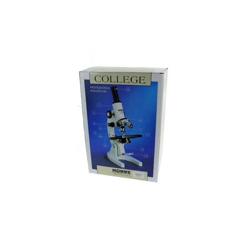 The Konus College Bio Microscope is the perfect introduction microscope for students and science lovers. The College microscope is equipped with a sturdy metal housing and has an adjustable magnification of 60x, 150x or 600x. The magnification is achieved through a 15x wide angle eyepiece and 3 different objectives equipped with a magnification of 4x, 10x, and 40x. The College microscope has a straight hollow tube with a 160 mm focal length, making it possible to photograph your observations.
