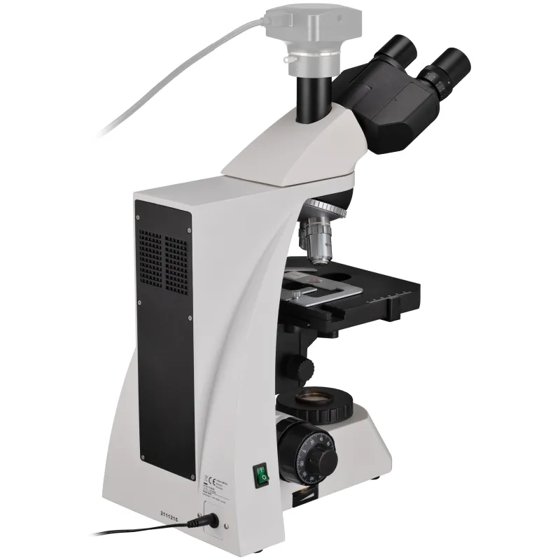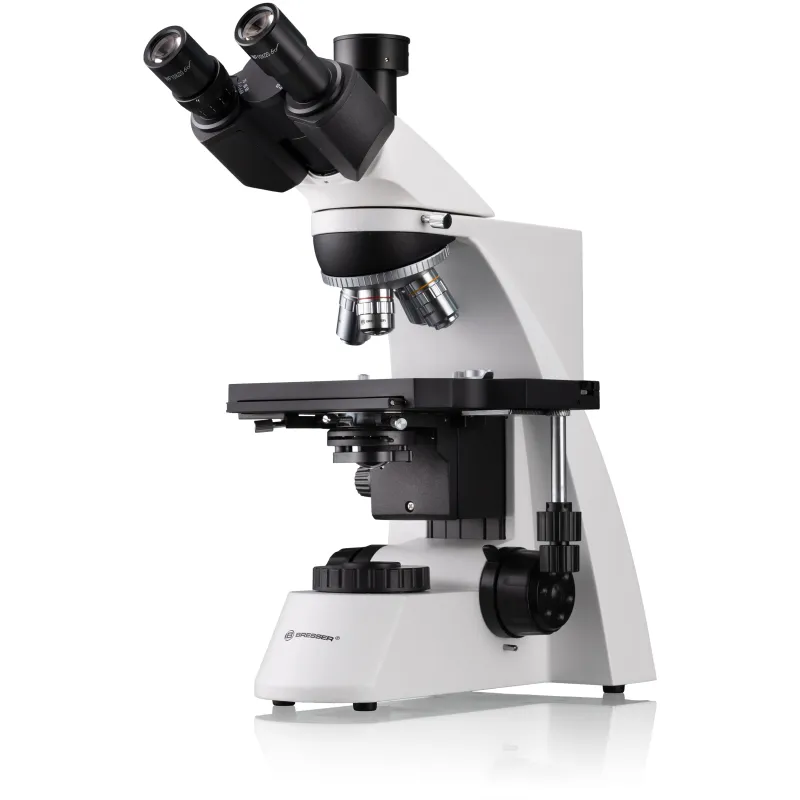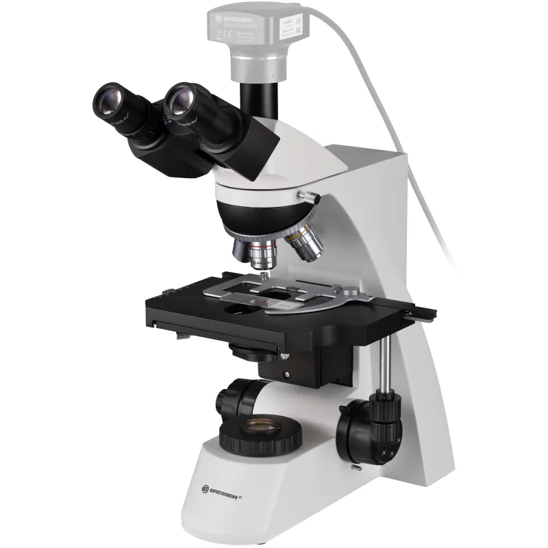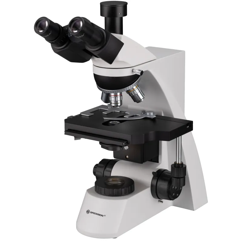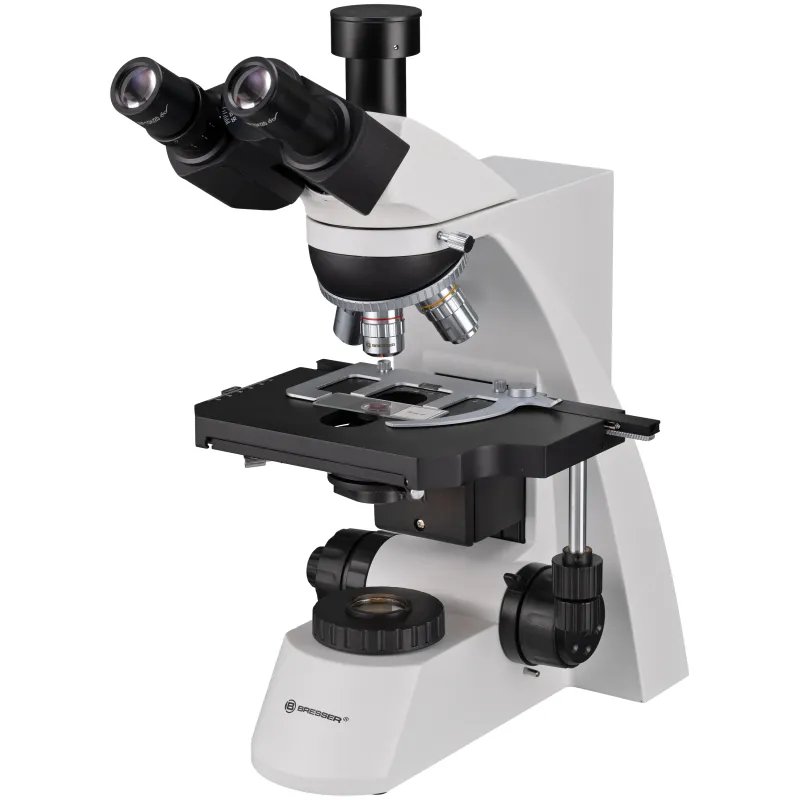 The BRESSER TRM-301 is a trinocular biological microscope of first-class quality : This means excellent imaging, good ergonomy, high stability and a modern attractive design. It is a laboratory microscope, which permits an intensive use, e.g. in medicine, biology, agriculture and industry area. Also, we can recommend it to the engaged hobbyist as his "microscope for a lifetime". A particular important feature of the TRM-301 is its ability for the Köhler illumination . This optimal illumination is bright, cool (going easy on the object), homogenous, reflex free and rich in contrast, so it makes the full use of the microscope optics. The Köhler illumination is standard for scientific research and microphotography. It is achieved with the fixed field diaphragm and the adjustable Abbe condenser (numerical aperture 1.25; with iris diaphragm). Naturally, the TRM-301 has the other features, which are typical for high-quality microscopes: lengthwise and cross moveable stage, ergonomic coaxial focusing knobs (fine focus: 200 µm / full turn), continous dimmer, planachromatic objectives (4x, 10x, 40x, 100x-oil retractable), 10x wide field eyepieces (mounted in 30° inclined eyepiece tubes), adjustment of eye relief, diopter adjustment and the phototube.