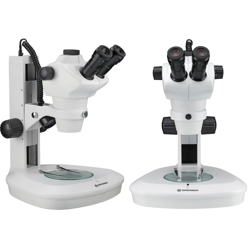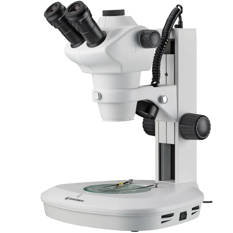 The BRESSER Science ETD-201 is a high-quality stereo reflected-light and transmitted-light microscope. It is perfectly qualified for medical applications , the use in agriculture and forestry , in criminology , in academic and scientific institutes and schools , as well as for the assembly and quality assurance of components in precision mechanics and electronic engineering. The extra wide foot with stage and exceptionally tall height range permit observations of large objects. The integrated reflected- and transmitted-light illumination can be used in combination and is dimmable . The angle of incidence can be user-friendly adjusted and locked in position. A continuous range of magnification from 8x to 50x is possible with the exchangeable wide field eyepieces (WF 10x) and the 6.25-times stereo zoom objective lens (0,8x-5x). The interpupillary distance and dioptre compensation can be adjusted individually. The trinocular microscope head is rotatable (360°) and comes with two 45° inclined eyepiece tubes and a separate camera tube for the attachment of a c-mount camera or MikroCam . Very versatile power supply system via USB port and cable or mains adapter (both included).