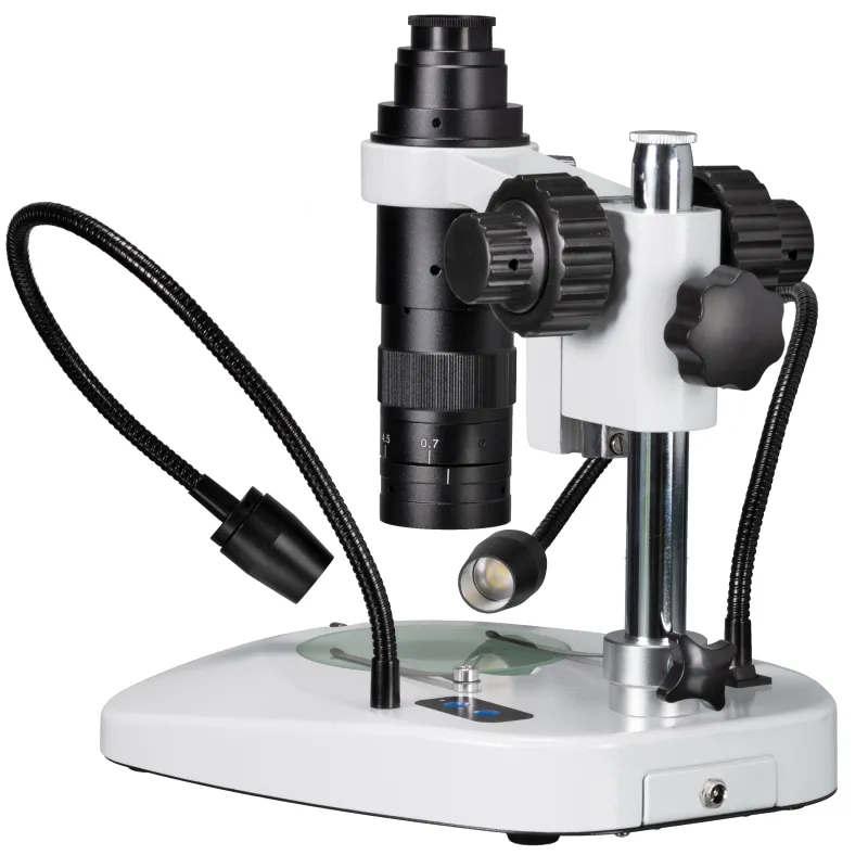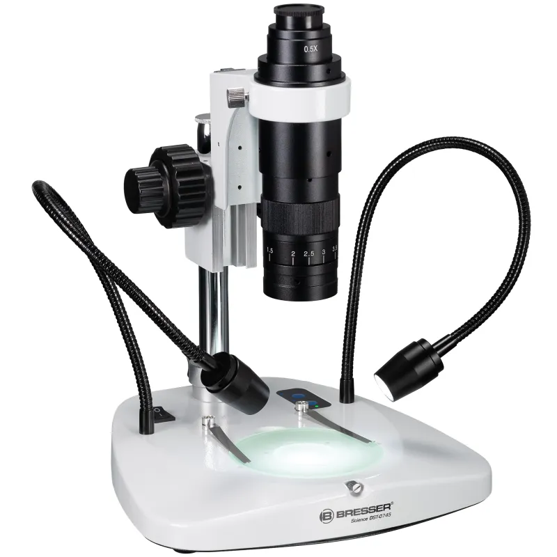 The BRESSER DST-0745 is a special microscope that is operated with a c-mount camera (camera not included). This allows direct viewing on a screen. Due to the vertically installed optics, there is no shifting of the image when focusing. This is especially useful for "focus stacking" shots. The zoom is continuously adjustable from 0.7x - 4.5x. A coarse and fine focus adjustment facilitates focusing, especially at high magnifications.