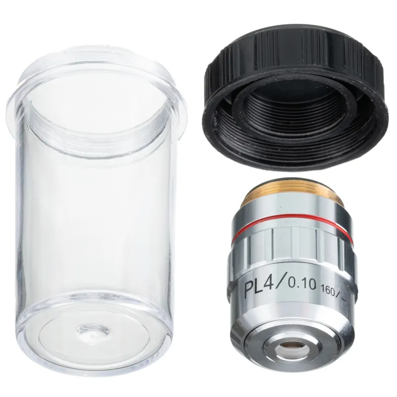 BRESSER plan achromatic objective lens 4x - these DIN objective lenses are processed with the highest quality materials to enhance the image replication. Plan correction minimizes refocus between center and edge of field and is especially useful for imaging.