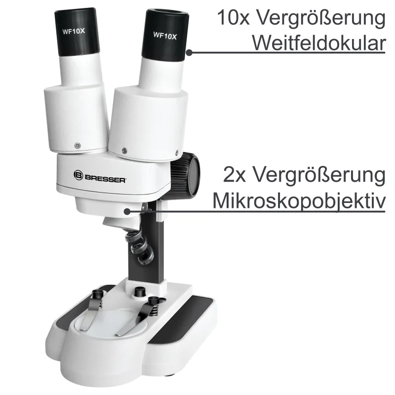 BRESSER JUNIOR – have fun experiencing the world of optics! Two eyes see more than one: using this stereo microscope , you can admire many things you find outside with a magnification of up to 20 times . Switch on the light, place the specimen on the microscope stage and here we go! This children's microscope is a playful way for young researchers to enter the exciting world of science . Go ahead and simply find your own answer to the question of what certain things are actually made of. It's easy to discover how the exciting microcosm is composed: all you need to do is take a closer look at everyday objects like coins, stones or insects! For a quick and easy start 12 mineral specimens are already included!