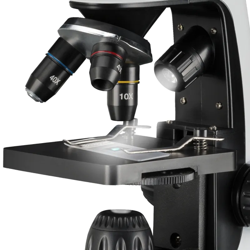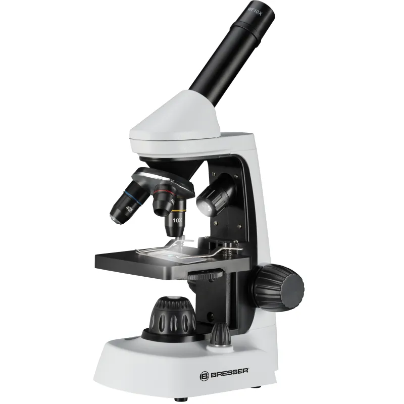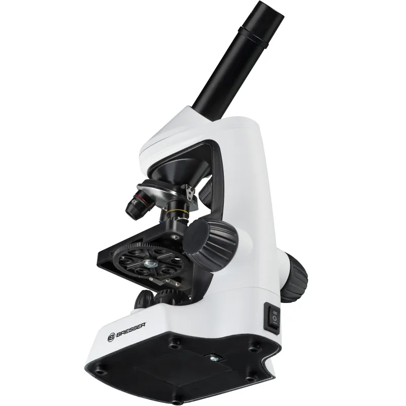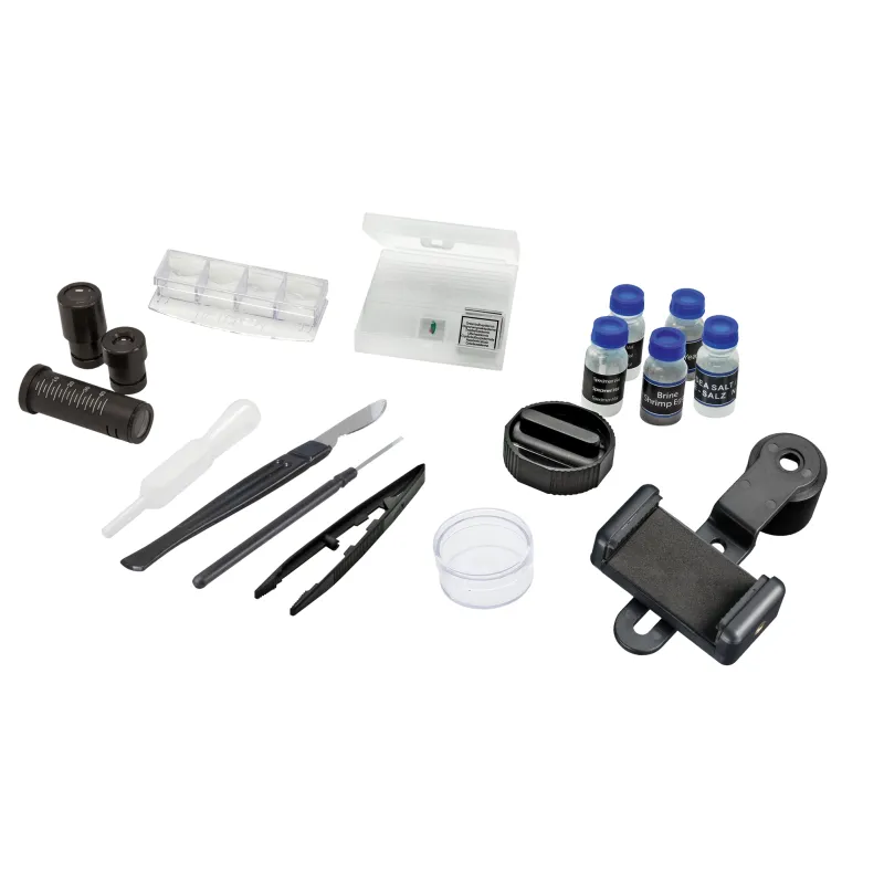 The BRESSER JUNIOR Microscope has up to 2000x magnification and a new innovative Smartphone Mount that allows you to take photos through the microscope. To ensure you're fully equipped, the accessories included provide the perfect introductory equipment . This includes, among other things, two wide-field eyepieces, a colour filter disk, many slides and storage containers. With its elegant Bresser design, the microscope has many useful features . The adjustable LED illumination can be used as an incident light for viewing opaque objects and as transmitted light for viewing transparent objects.