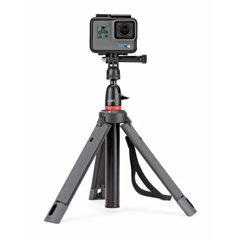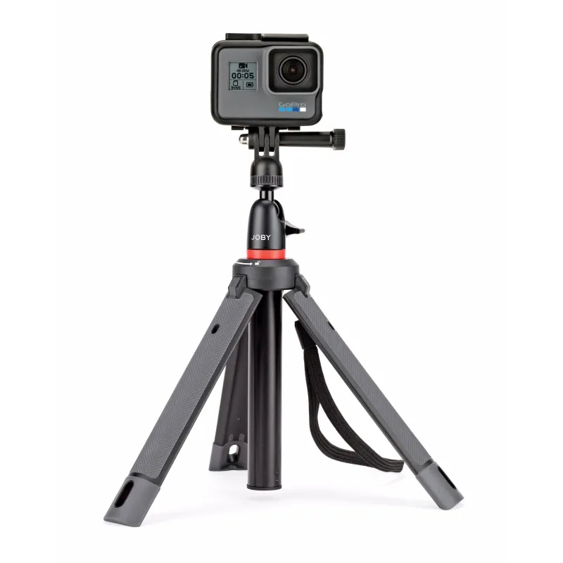 Supports compact point and shoots, 360 and action cameras (additional pin joint mount required). The included locking ball head allows for unique angles and levels the shot when placed on uneven ground. Works with multiple JOBY mounts including GripTight ONE, GoPro Mount, Flash mount or any ¼”-20 device under 325g. Great for mounting a lightweight microphone or small LED light!